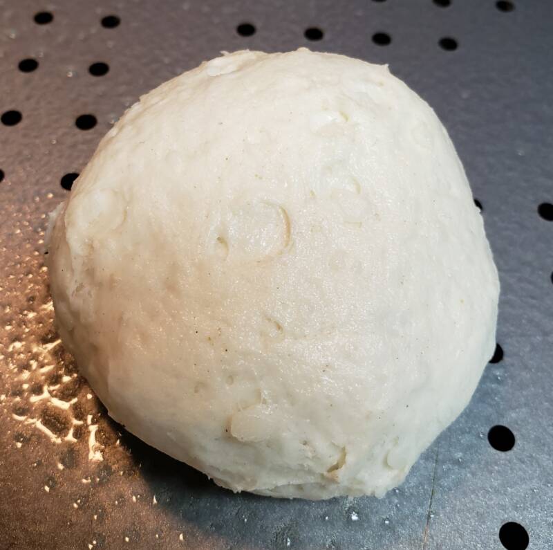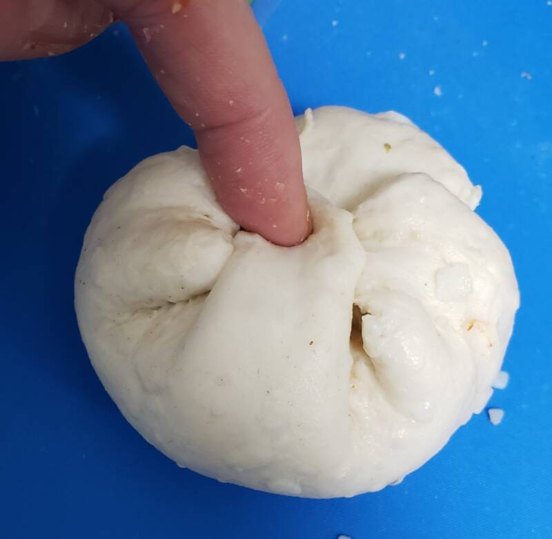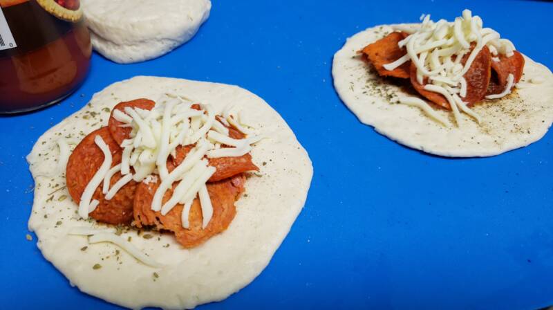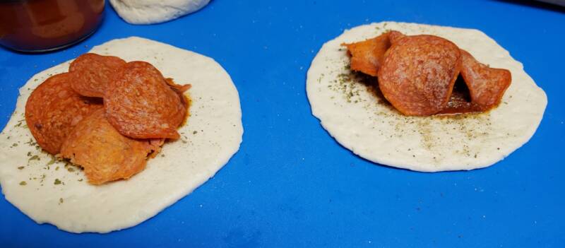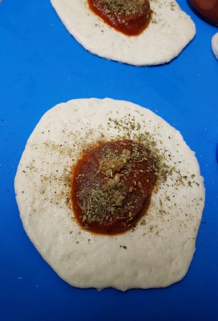Top with a spoonful of pizza sauce in the center of the dough round and sprinkle with some Italian seasoning or pizza seasoning.