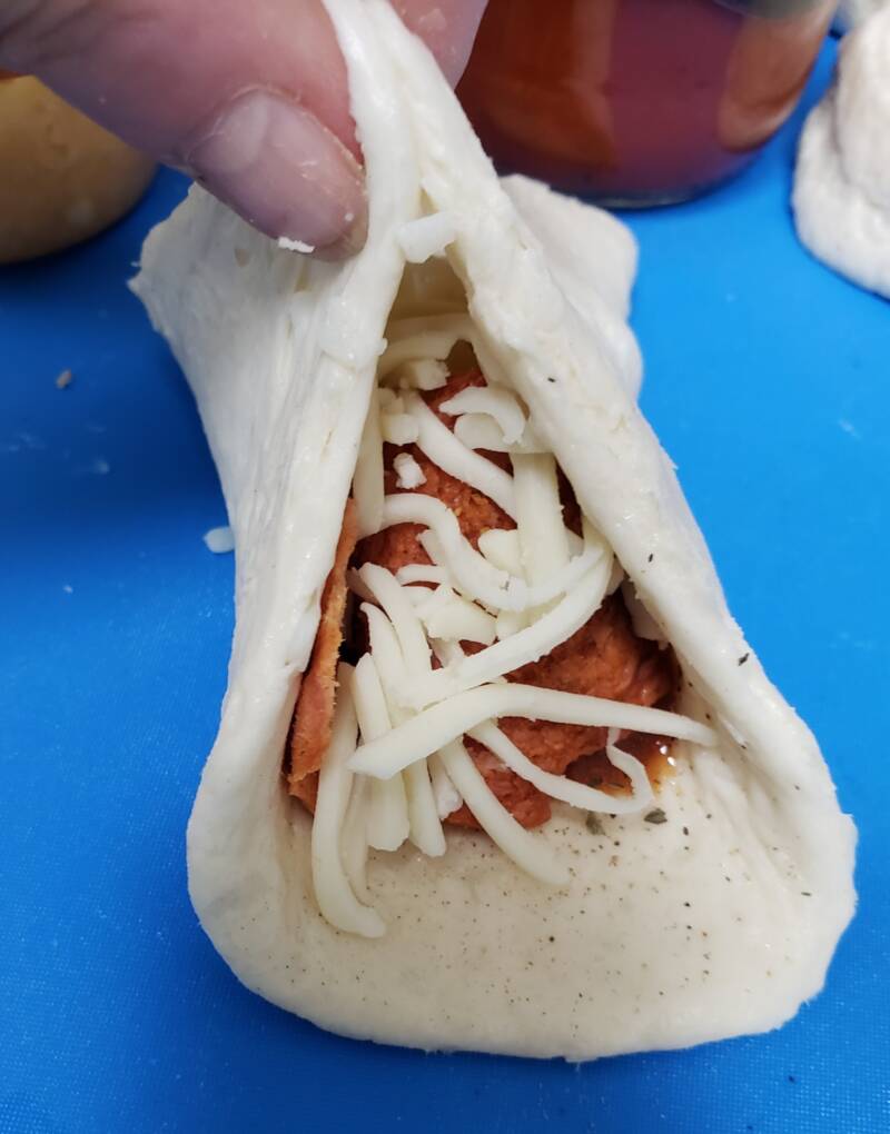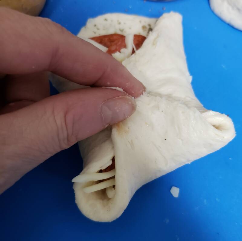 Fold two edges of the dough up and over the filling and press to seal together. Repeat with the remaining two sides to meet in the middle. Press the edges together carefully and slightly tuck them under,