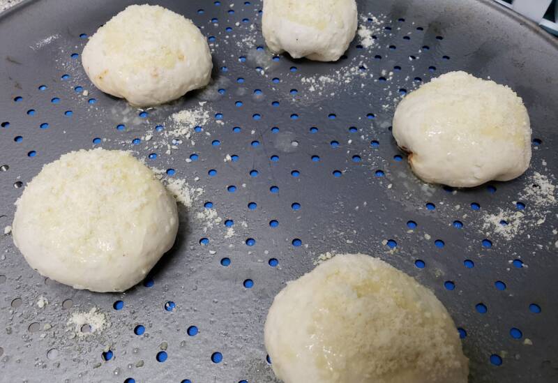- Place the bombs with the seam side down on a greased bakingsheet and brush with melted butter.