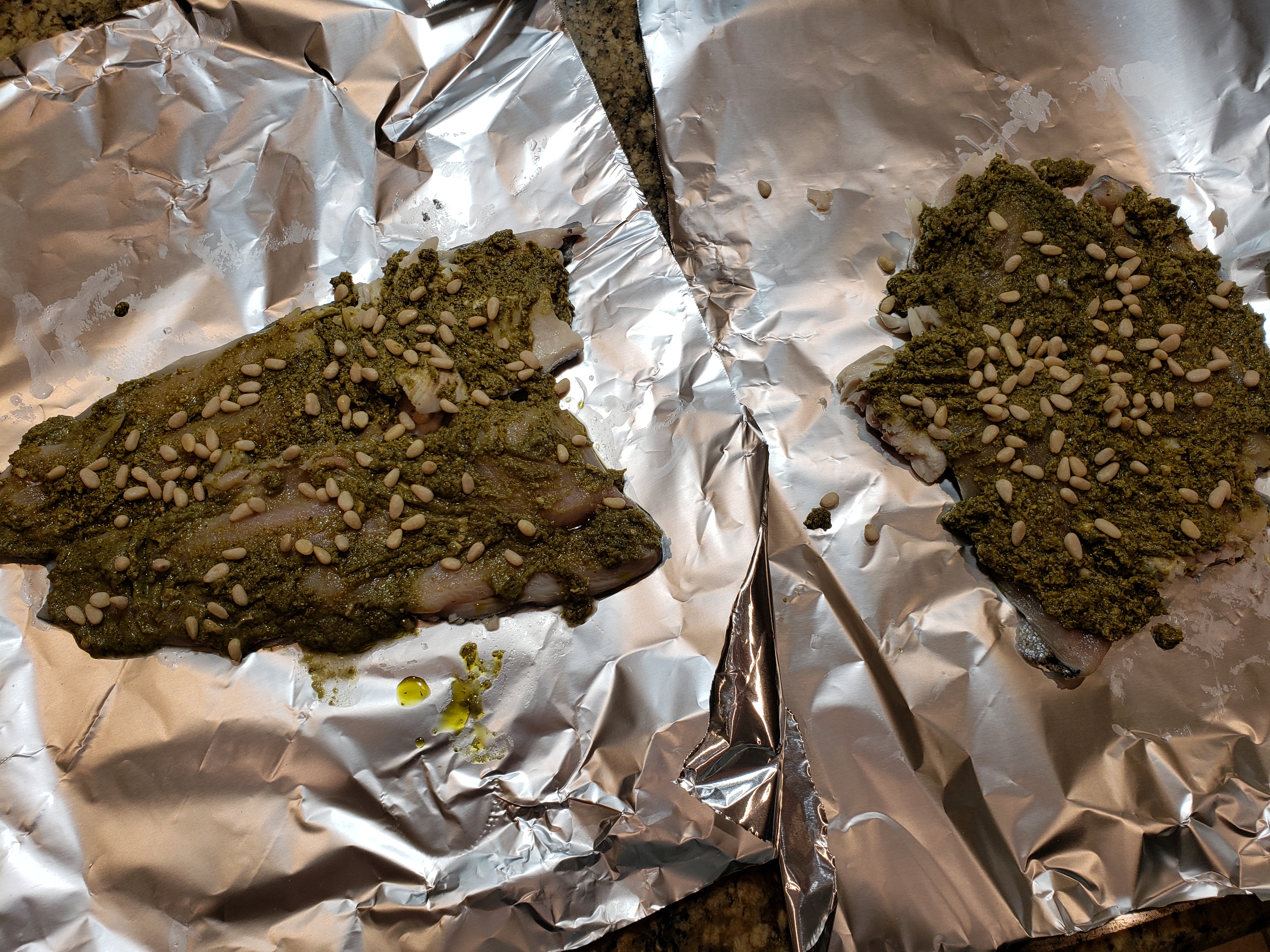 Spread a generous amount of pesto on each fish filet. Different brands of pesto come in different-sized jars. I used the Priano Pesto from Aldi which is a smaller size jar, so I used two jars to spread on all four of the trout filets. Costco sells an absolutely HUGE jar of pesto, I think you would not even use half of that size jar. I guess my point is to use your judgment about how much pesto you want to spread on your fish. Sprinkle the fish with pine nuts.