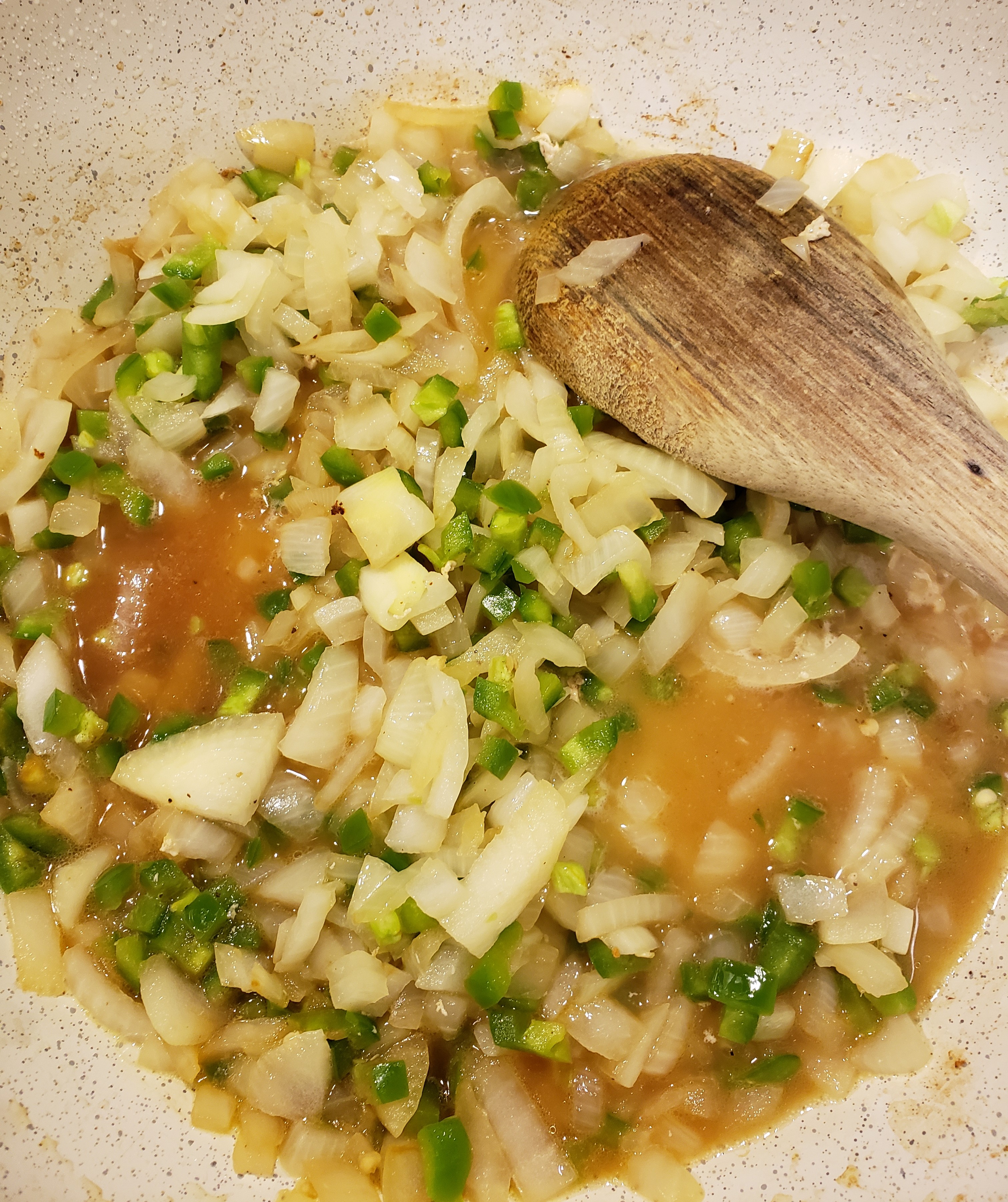 In a food processor or blender, mince the jalapenos. In the same pan that you browned the chicken, melt the butter. Add the minced jalapeno, garlic and sliced onion and sauté until translucent. Add the chicken broth and salsa Verde. Bring to a boil.