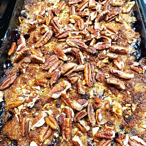 - Remove from the oven and sprinkle the pecans over the top.