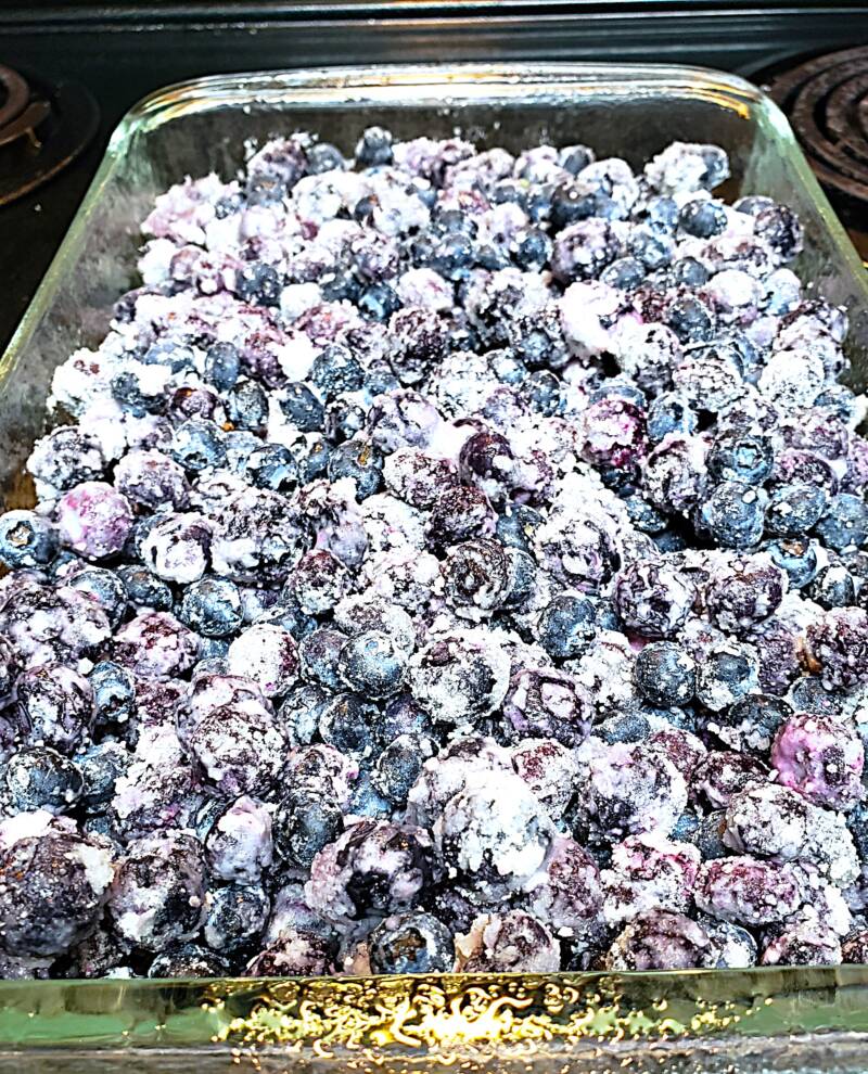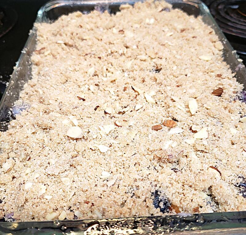 - Sprinkle the topping mixture over the top of the blueberries.