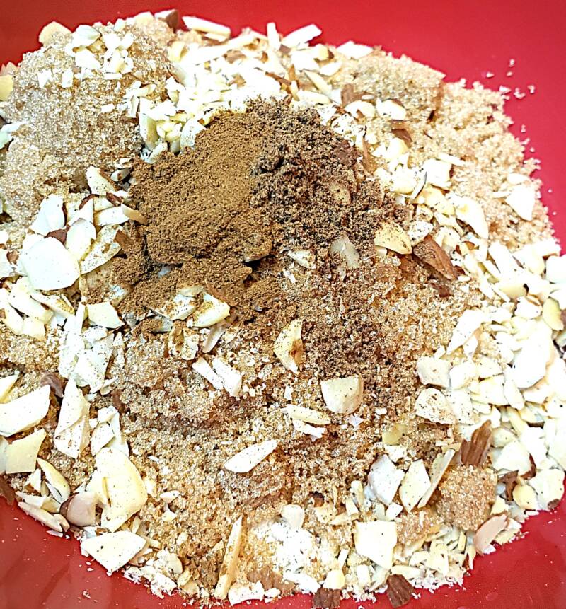 In a separate bowl, the remaining Keto cake mix, chopped sliced almonds, brown sugar Swerve, cinnamon, and nutmeg.