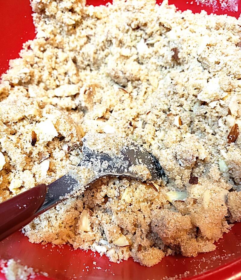 - In a separate bowl, the remaining Keto cake mix, chopped sliced almonds, brown sugar Swerve, cinnamon, and nutmeg.