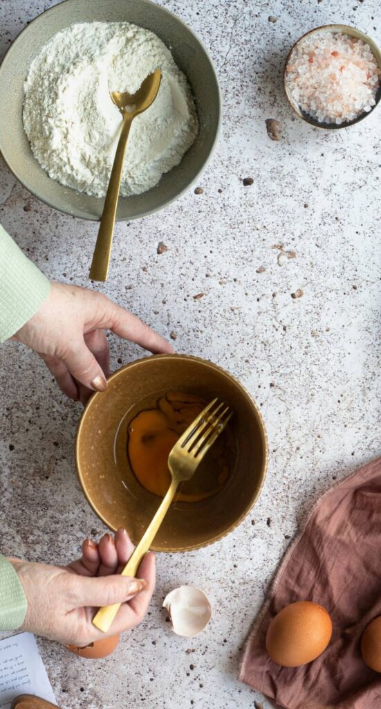 Add the almond flour, coconut flour, baking powder, xanthum gum and salt. Mix well until the mixture is smooth.