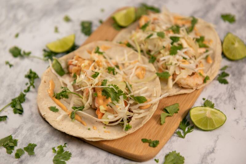 To build the tacos, place the shrimp in a taco shell. I used the Siete brand crispy taco shells made with almond flour. Add your favorite toppings, such as cabbage, chopped cilantro, cheese or avocado. Top with the sour cream sauce and a squeeze of lime juice.