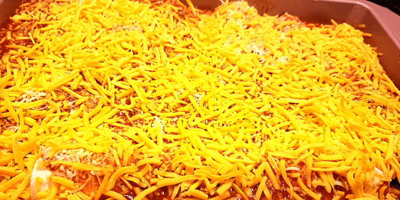 • Pour the remaining enchilada sauce on top and sprinkle with cheese.