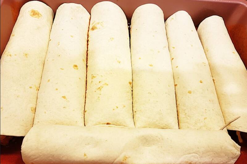 • Place the rolled up enchiladas in the baking pan side-by-side.