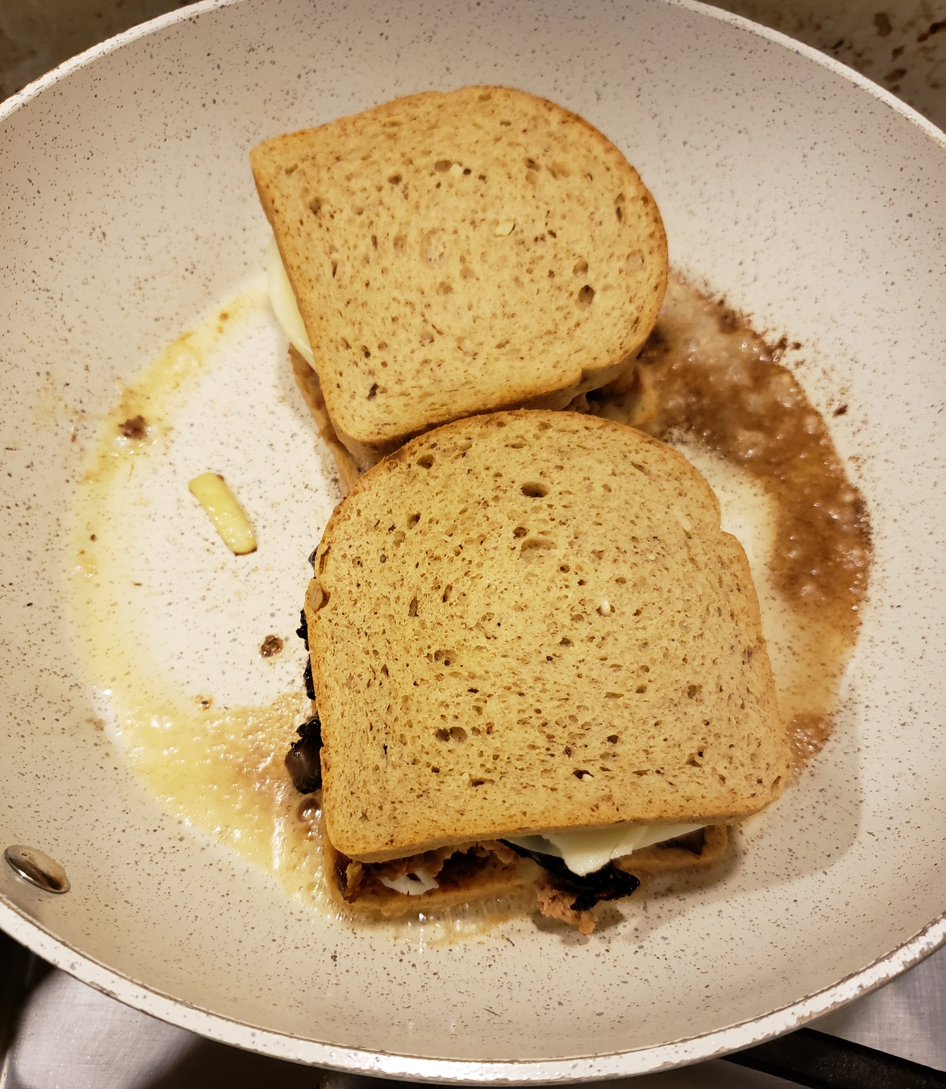 Cap it off with another piece of bread. Heat a couple of tablespoons of butter in a clean skillet. Fry the sandwiches two at a time in the skillet. When the bread is toasted and golden, flip it to the other side and fry until that side is golden and crispy. Add some more butter to the pan as needed for each side of the sandwich.