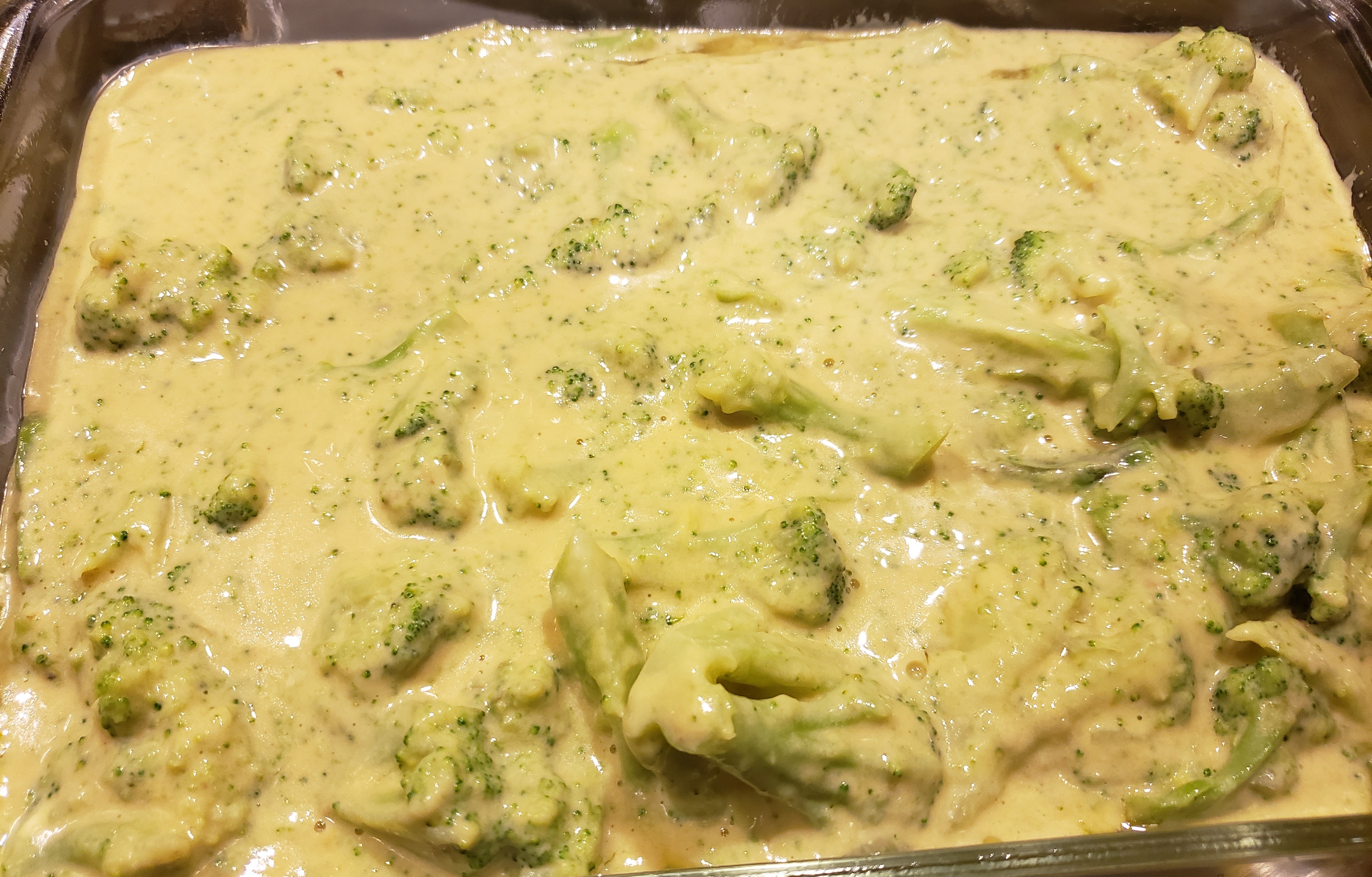 In a rectangular baking dish, place the steamed broccoli. Evenly pour the cheese sauce mixture over the broccoli evenly. Stir to coat the broccoli.