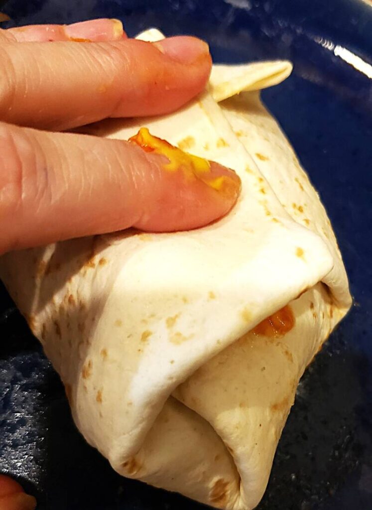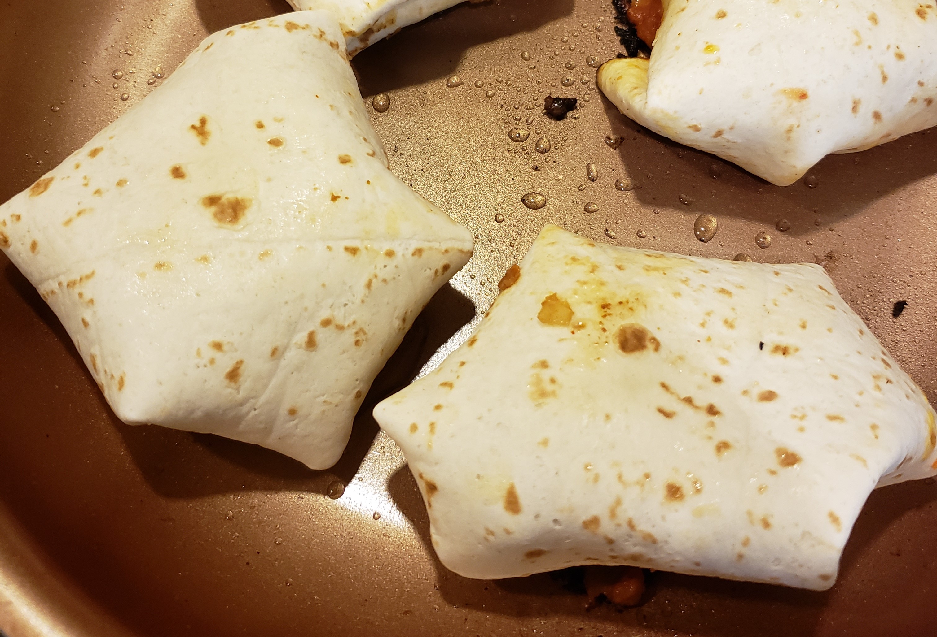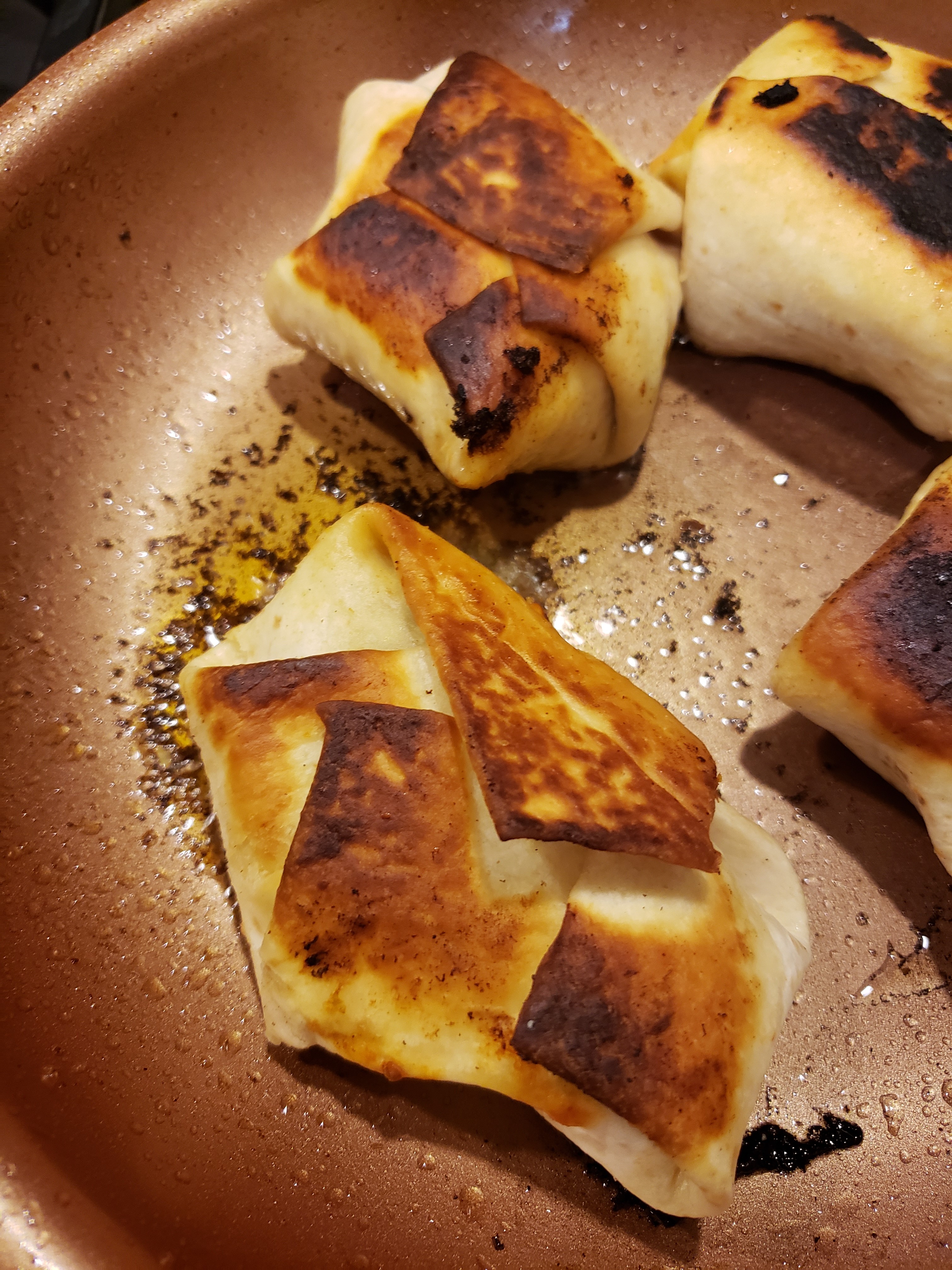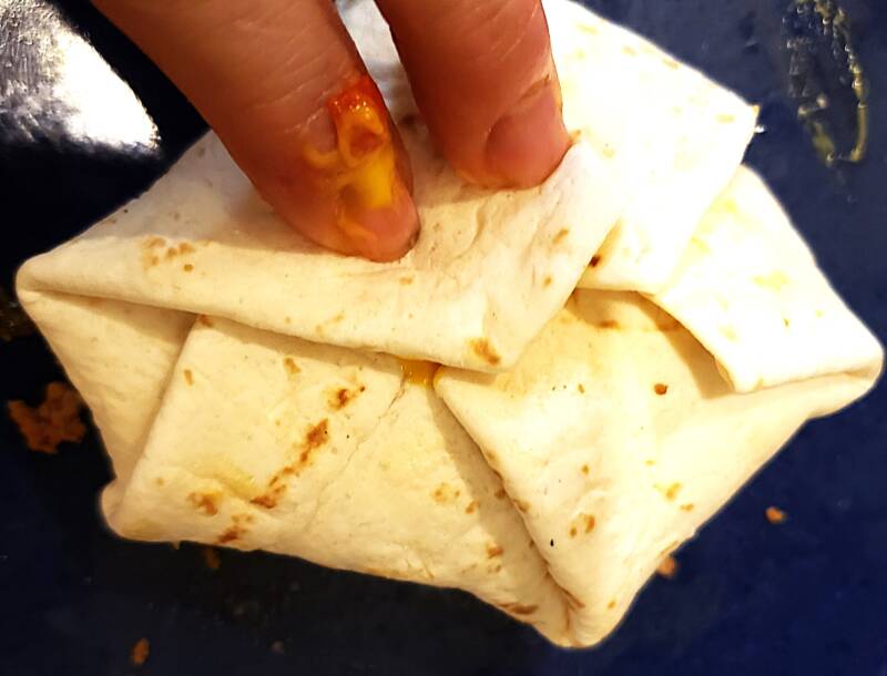 Fry until the tortilla is browned and the tortilla does not come unwrapped. Turn to the other side and brown on that side. Repeat with the other taco pockets.