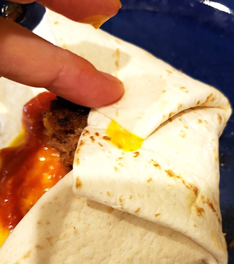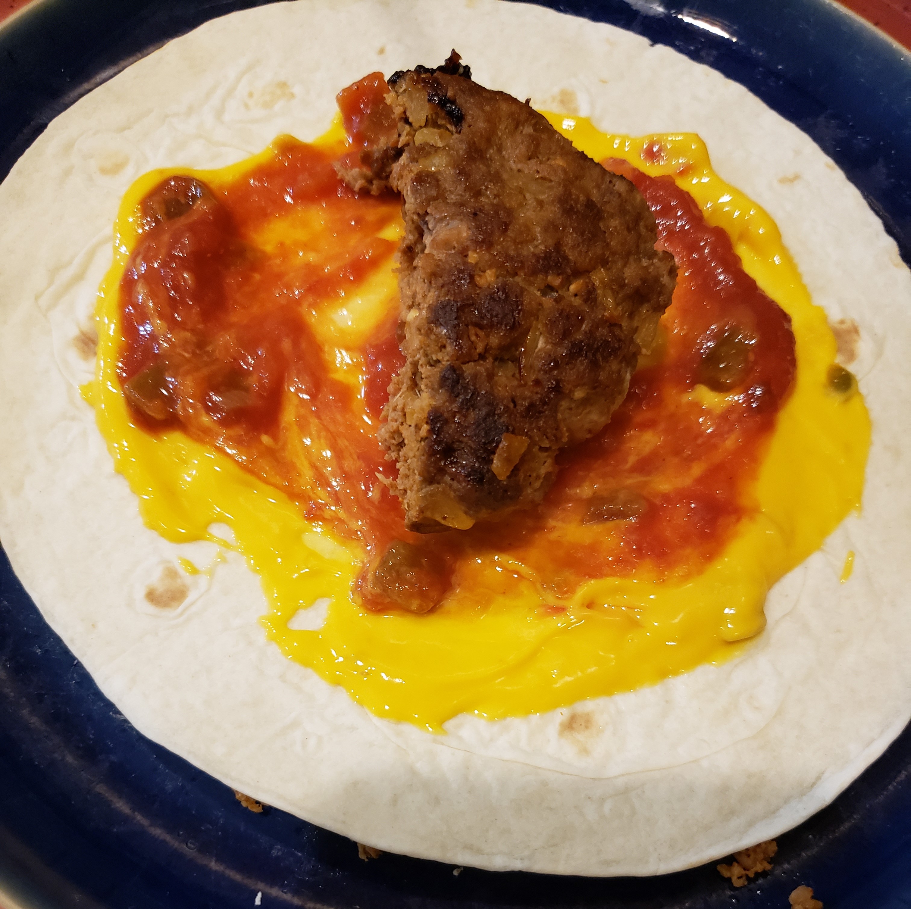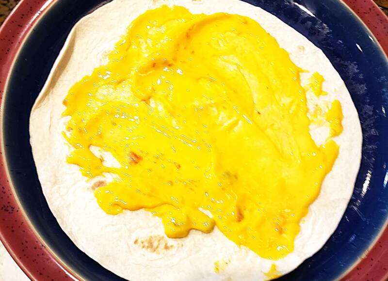 Top with some salsa and spread it over the cheese dip. Place your patty in the middle of the tortilla. If you are not Keto, you can use the big burrito-size tortillas. If you are Keto/low-carb, you must use the low-carb tortillas, which are much smaller. Because of this, you will have to cut the pattie in half; otherwise, it will not fit in the tortilla.