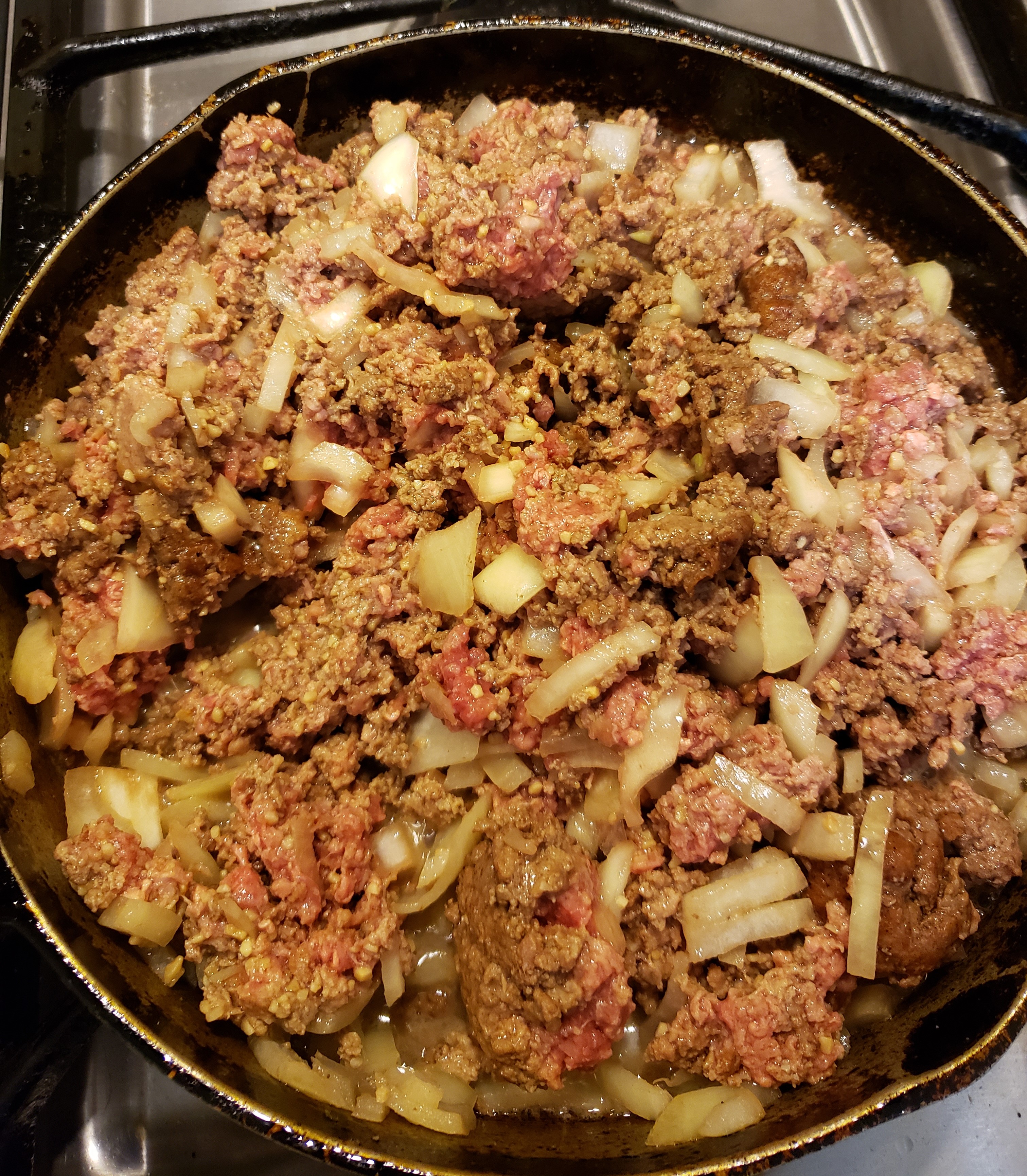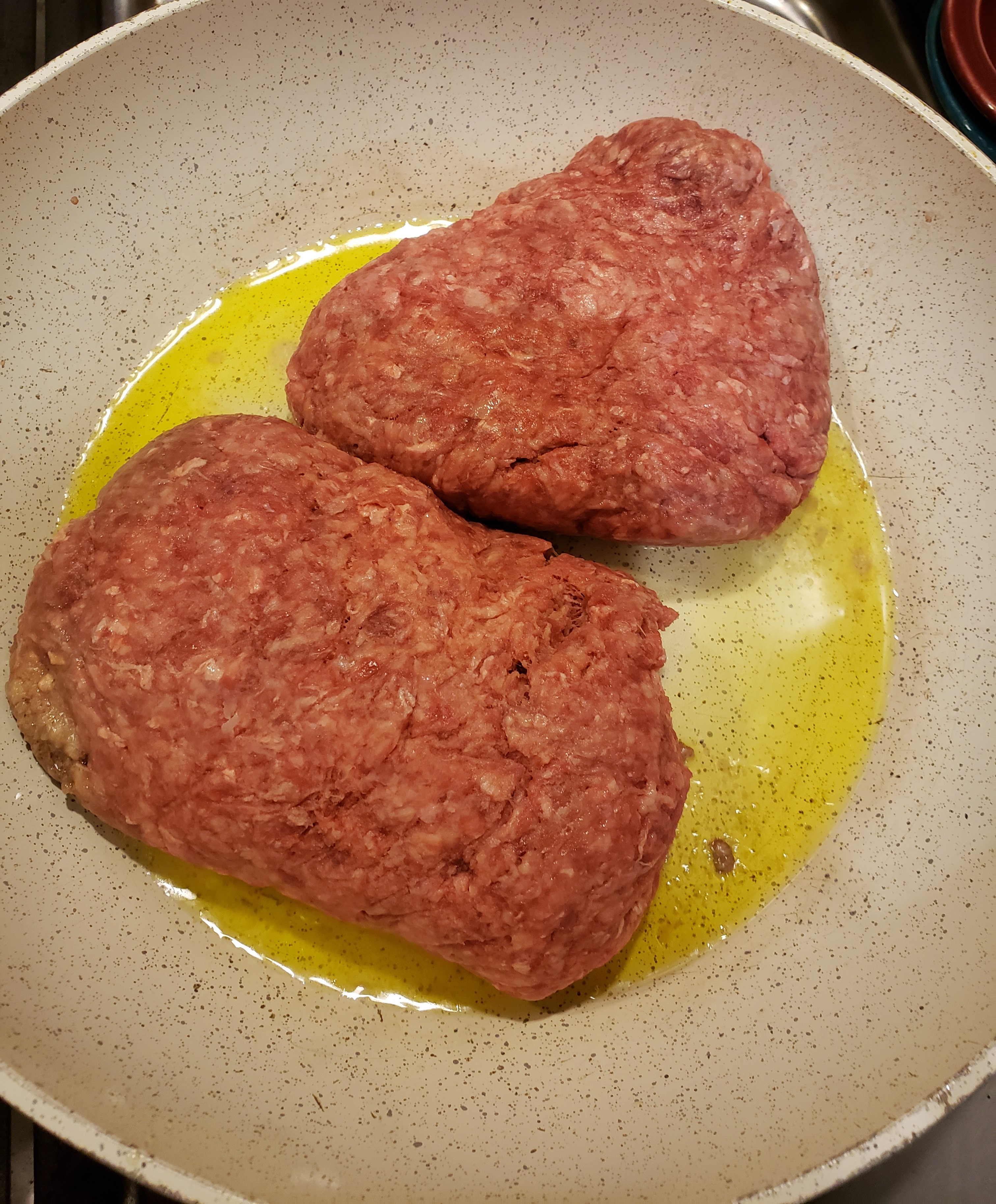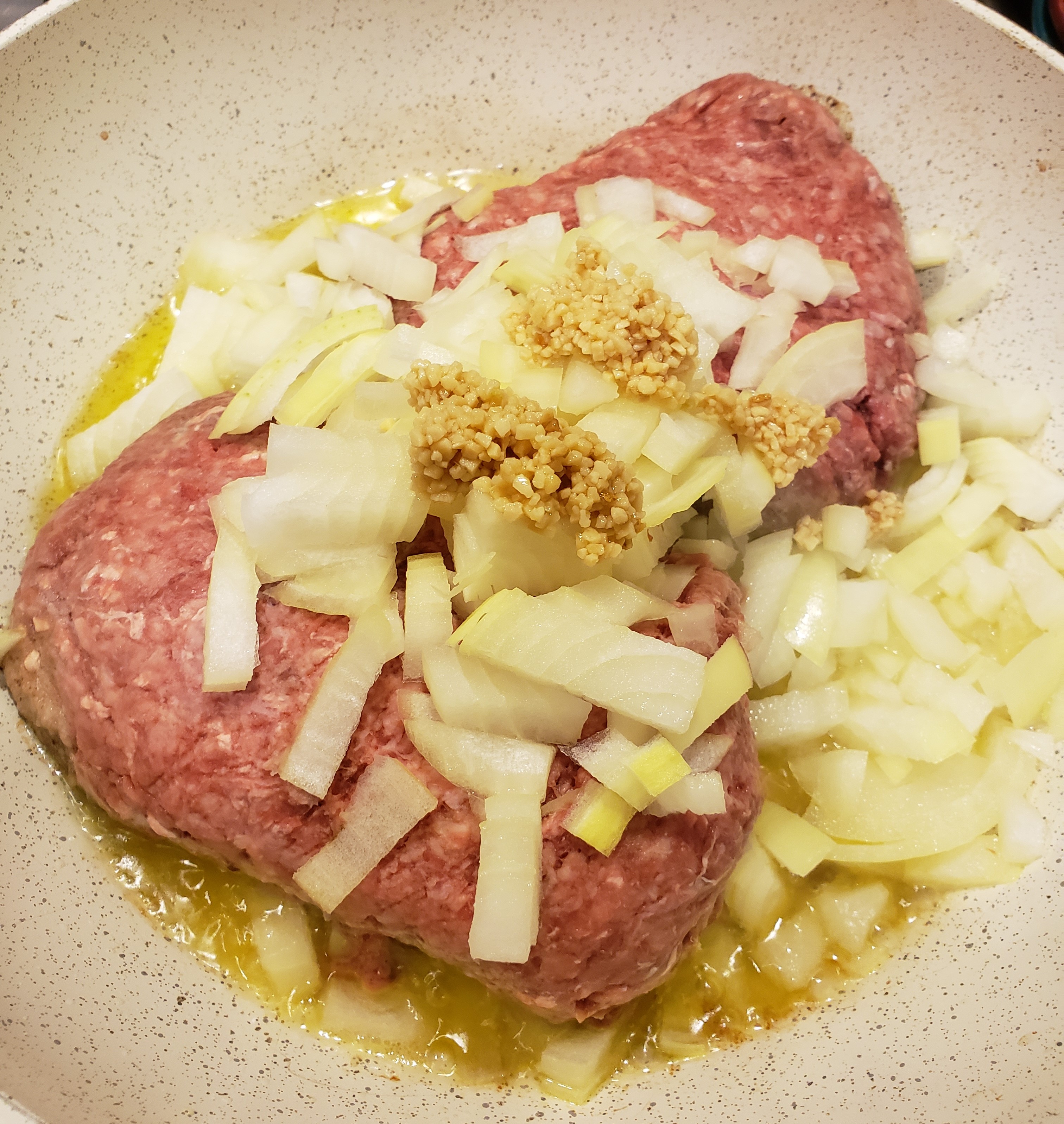Brown the ground beef, onion and garlic in a pan with a little bit of olive oil.