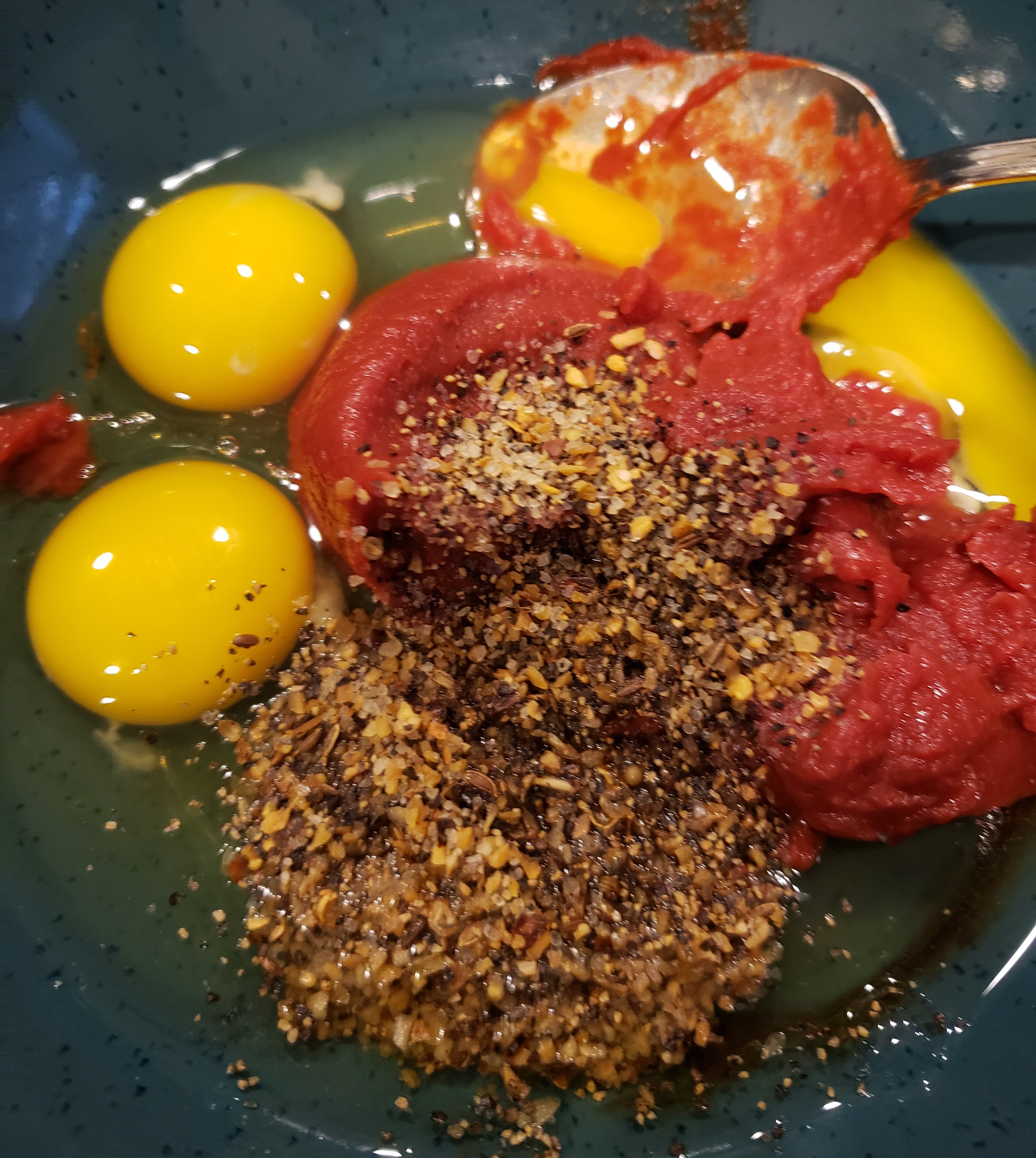 In the meantime, mix together the eggs, tomato paste and Montreal steak seasoning in a medium bowl. Stir to combine.