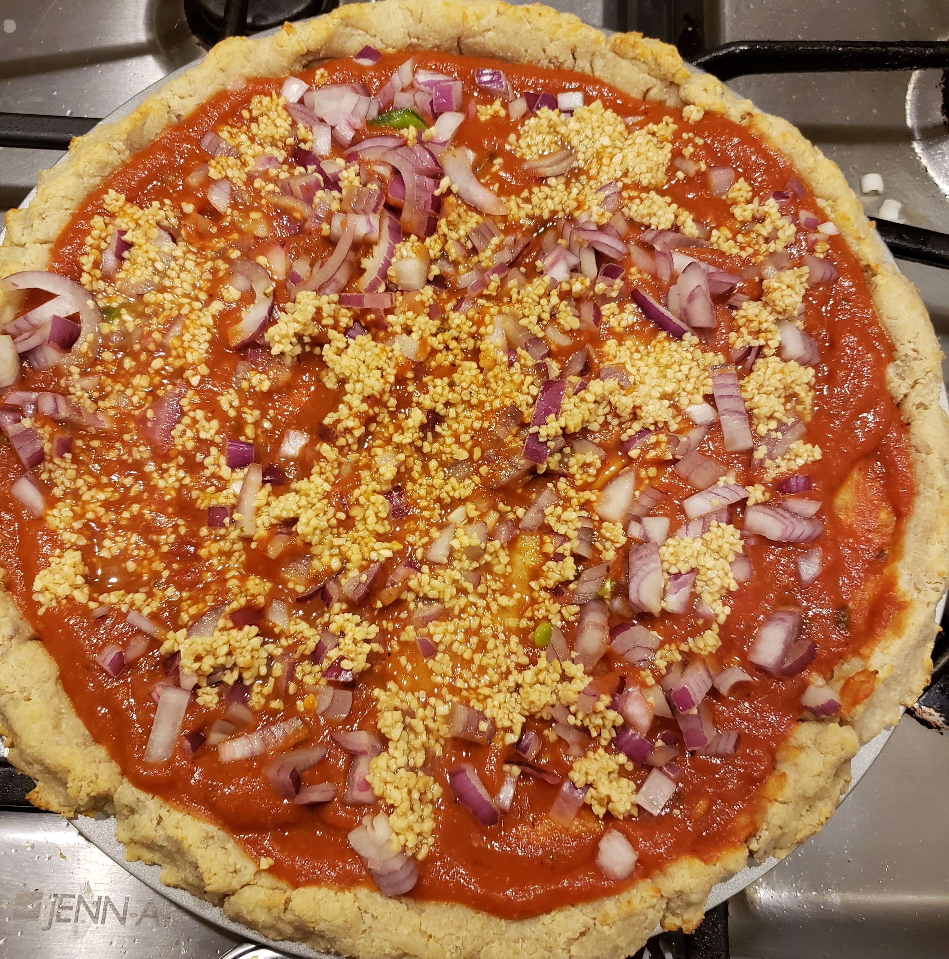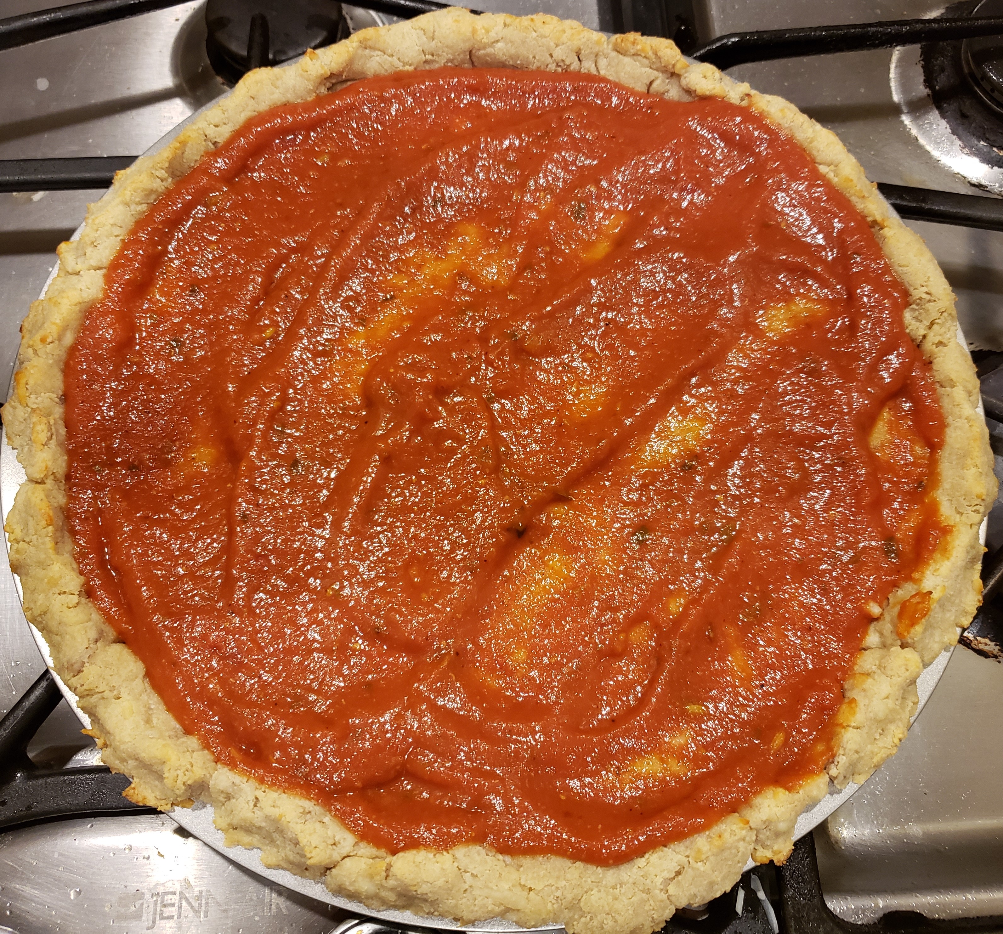 Bake the crust in a 350-degree oven for 12-15 minutes. Pour the pizza sauce over the crust and spread it out with the back of a spoon.