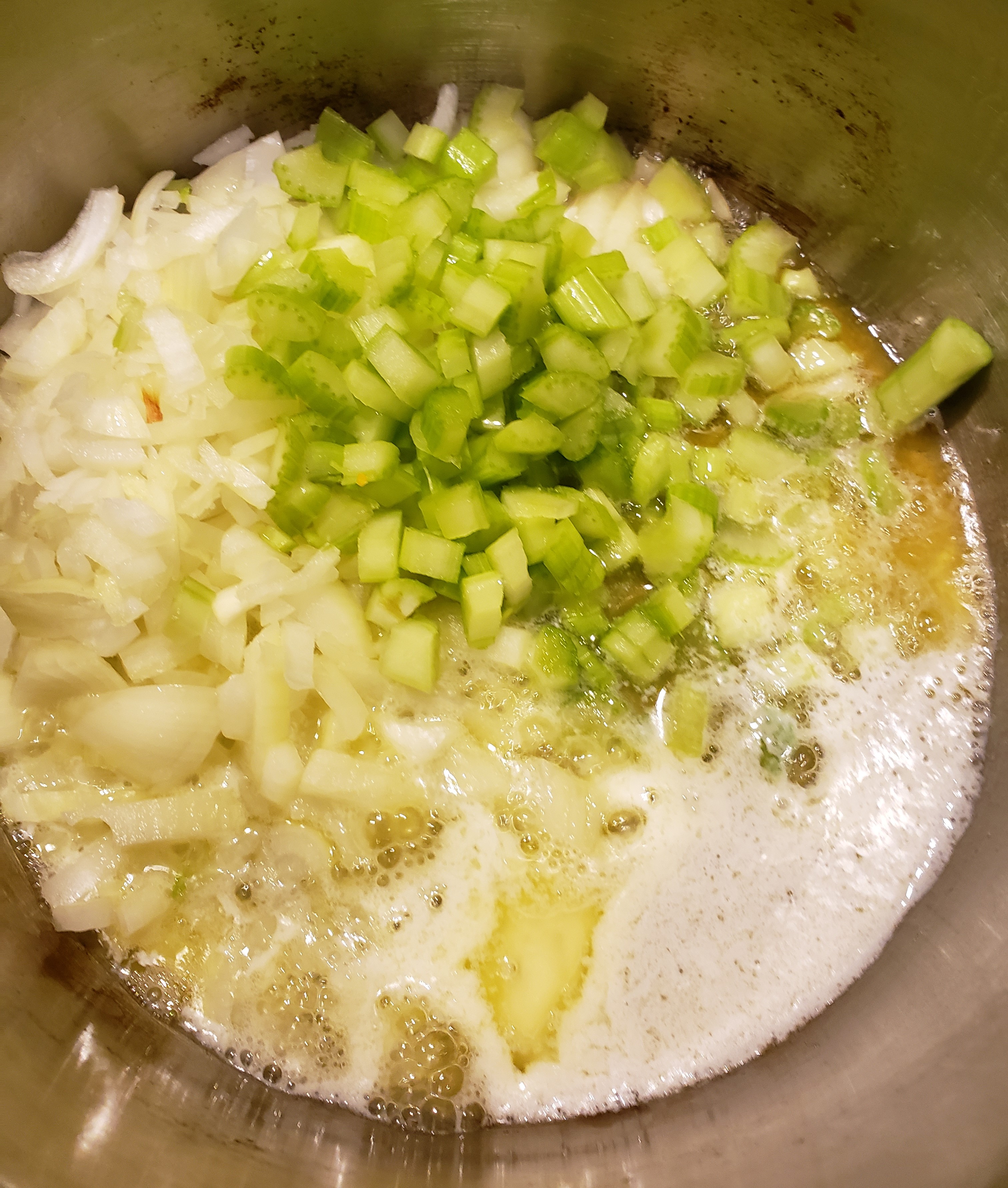 In a Dutch oven, sauté the celery, onion, and garlic in butter until translucent.