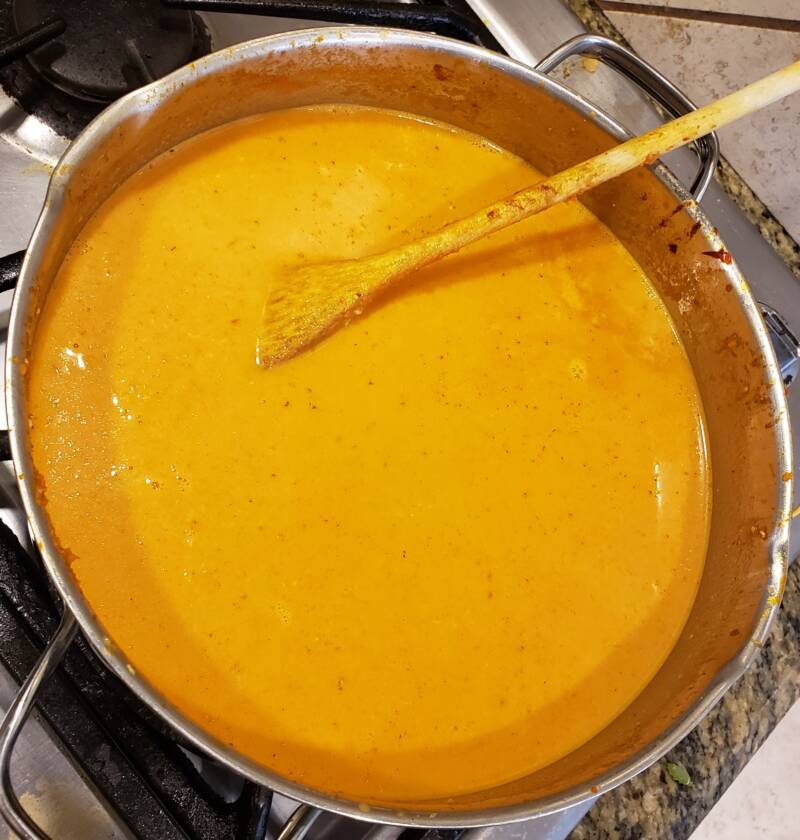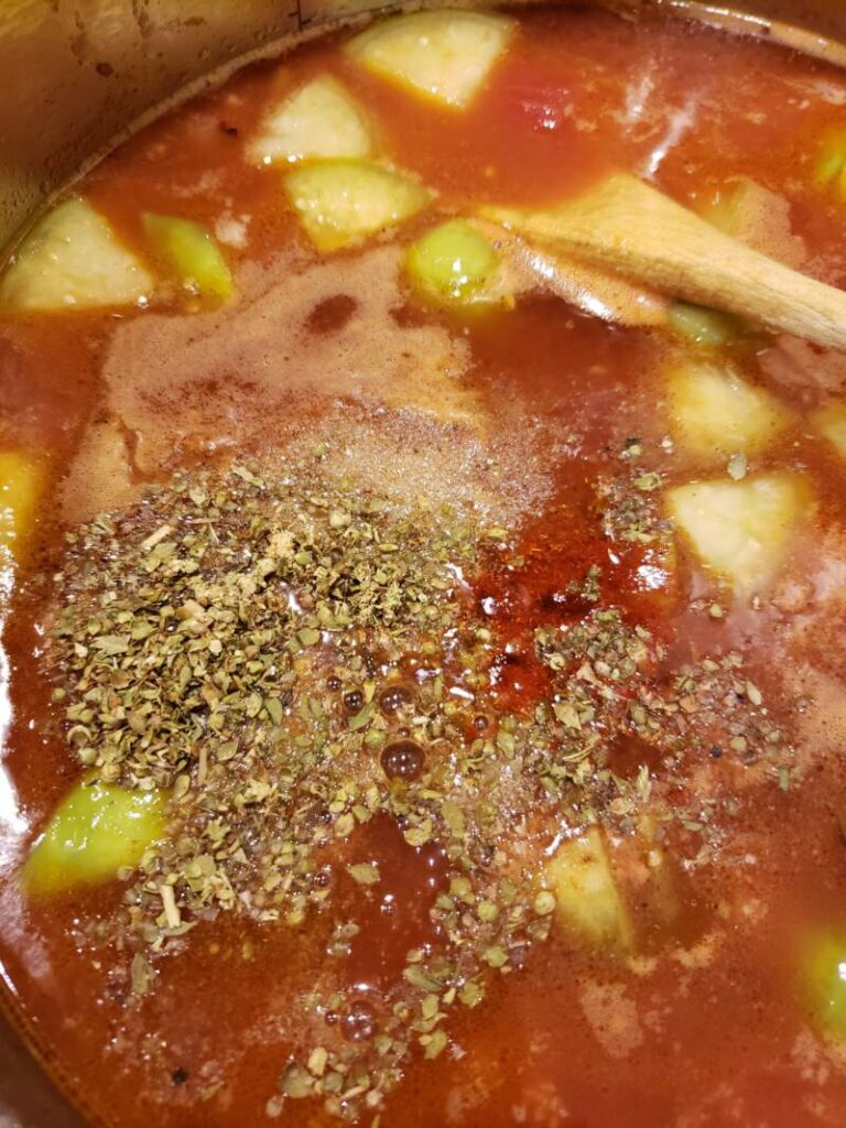 Add the tomato juice and chicken broth. Heat to a low boil. Add all the spices: Worcestershire, sherry, hot sauce (you don’t have to use any hot sauce if you do not want to), salt and pepper, cayenne, seafood seasoning, oregano, smoked paprika, and bay leaf. Stir well. Allow to simmer for 30 minutes.