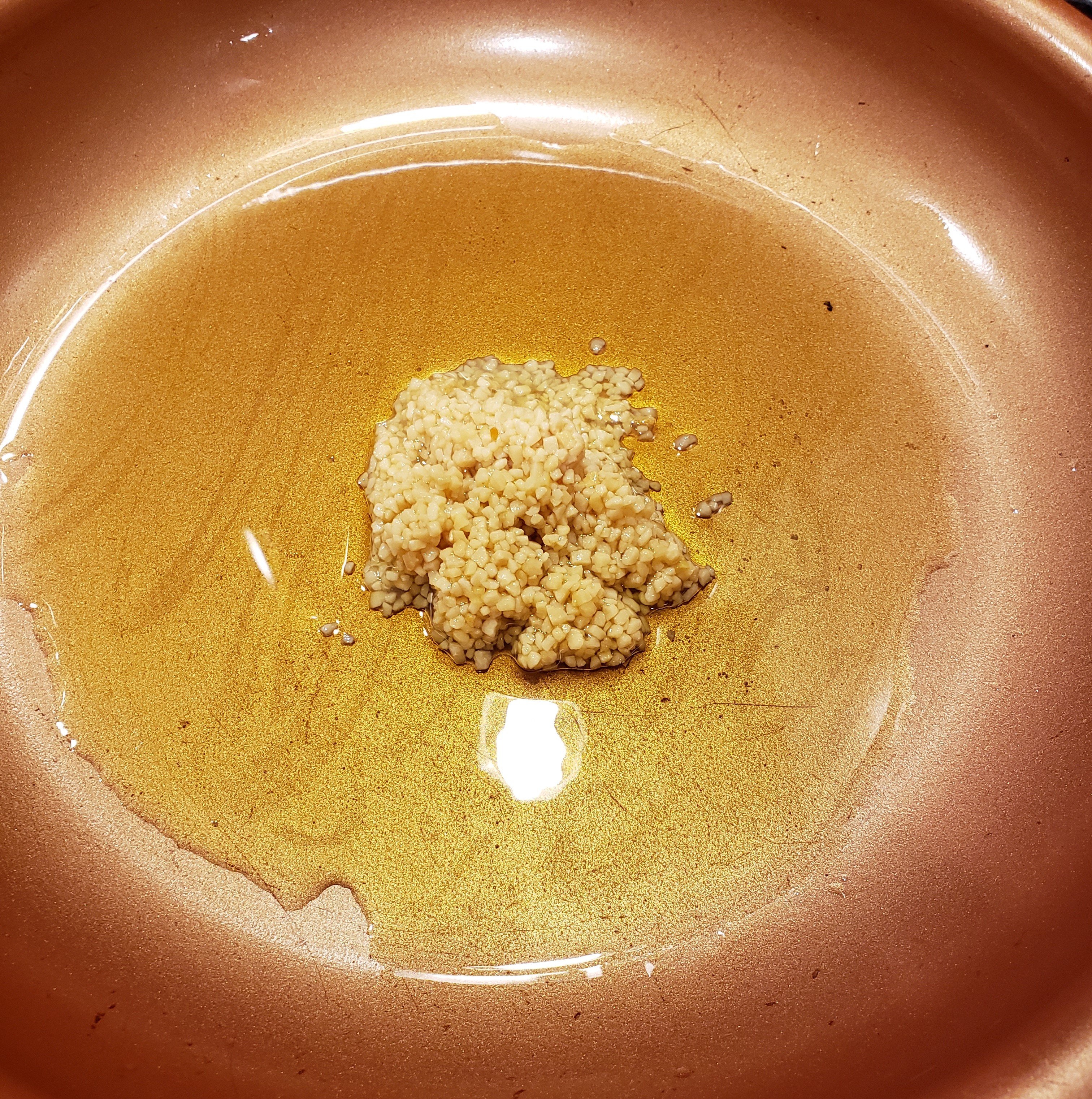 Add one tablespoon of oil to the pan. Add the garlic. Be careful not to allow it to burn.