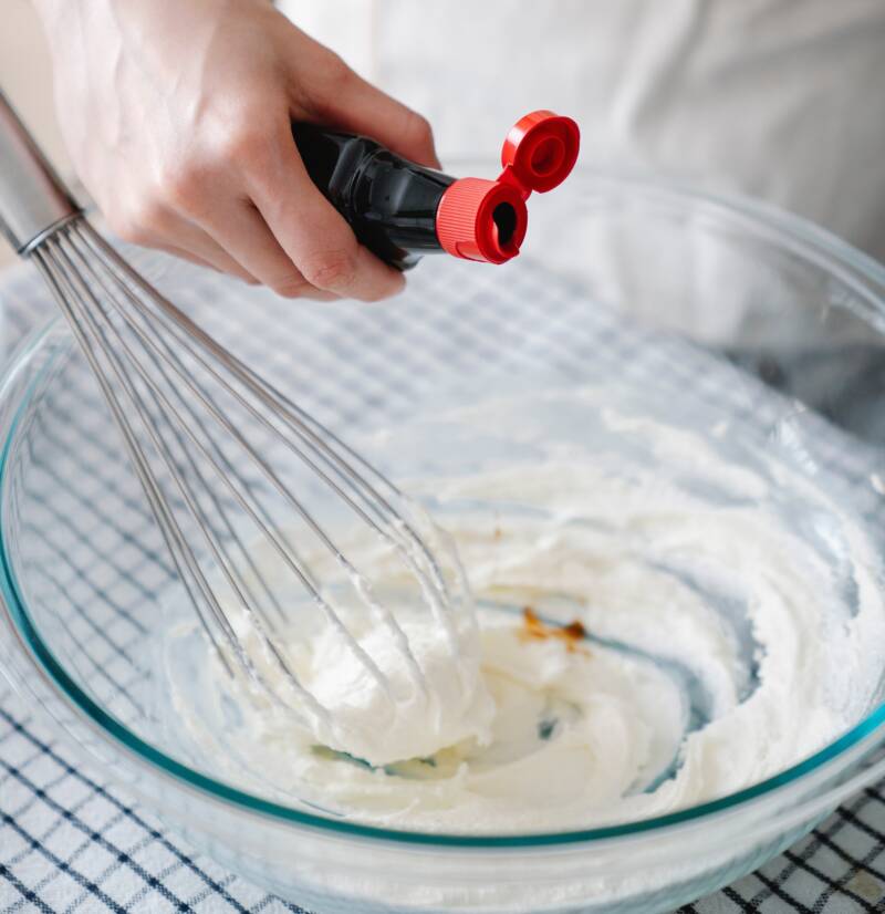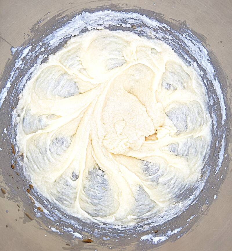 - Beat in the vanilla and almond extracts.