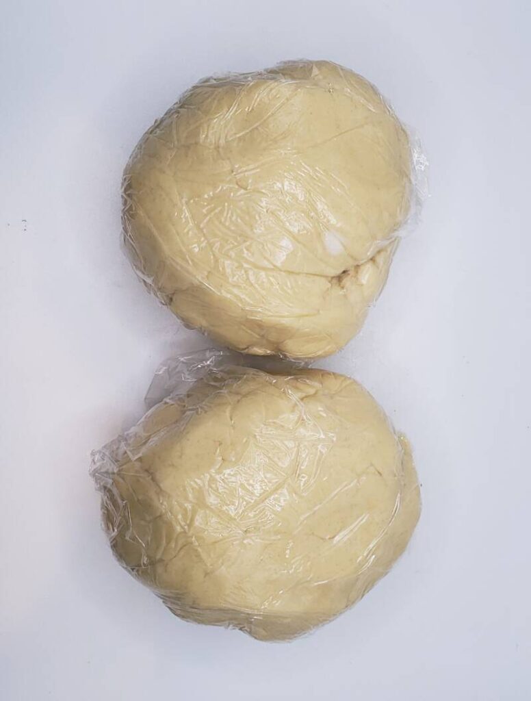 - Divide the dough into two large balls and wrap in plastic wrap. Place in the refrigerator to chill for at least one hour.