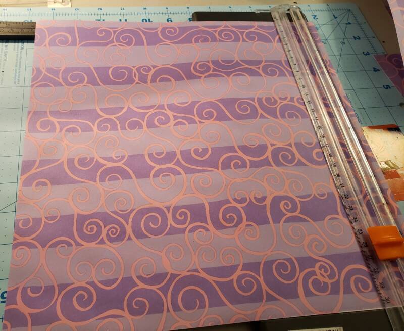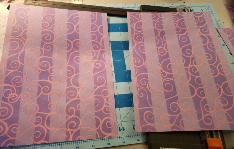 Measure and cut two pieces of the same 12 x 12 scrapbook paper design for the front and back covers at 11″ x 8″.