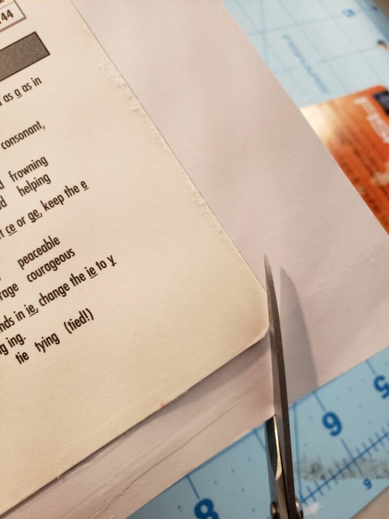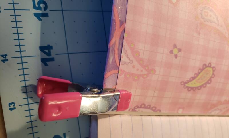 Cut the remaining two 12 x 12 pieces of scrapbook paper to use for the inside cover of the notebook at 7-1/4″ x 9-1/4″. Lay the papers on a flat surface side-by-side. On the paper on the left, round the corners on the left side of the paper only. On the paper on the right, round the corners on the right side only.