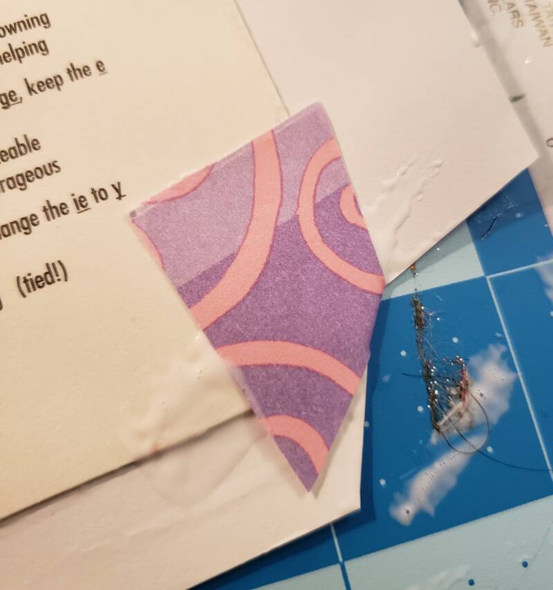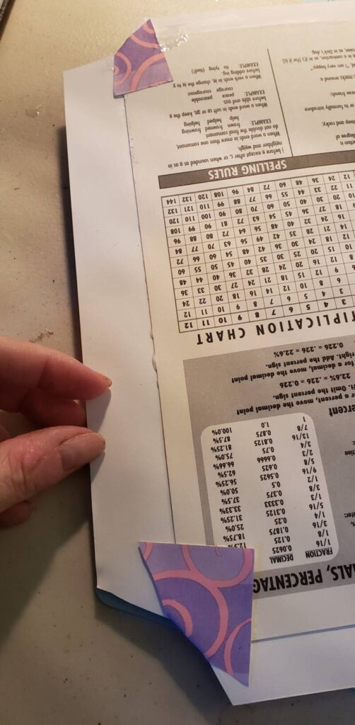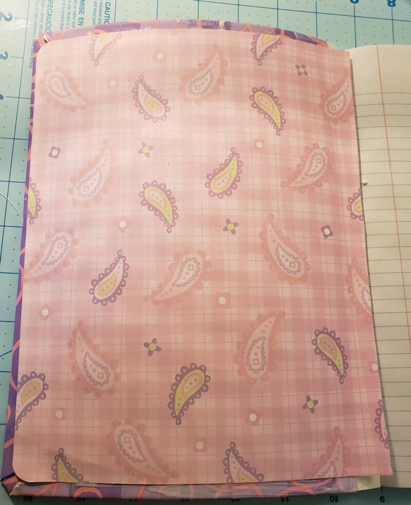 Then, apply mod podge to the side flaps and fold up to adhere the flaps to the inside cover of the notebook. Wipe away any excess glue with a tissue.