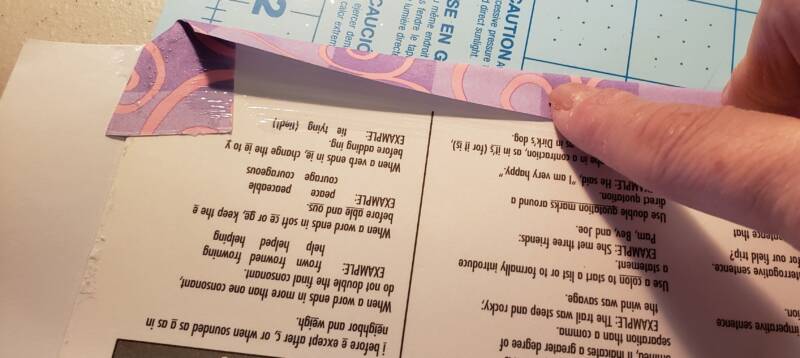 Apply Mod Podge to the inside cover of the notebook. Adhere the inside cover paper to the inside of the front cover. Line up the paper so that the rounded corners cover the mitered edge. The flat side of the paper on the binding edge will remain about 1/4″ from the notebook paper. Wipe away any excess glue with a tissue and burnish any bubbles with a bone folder.