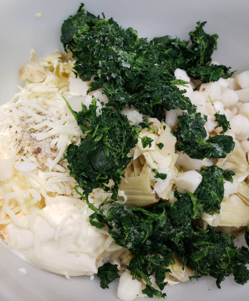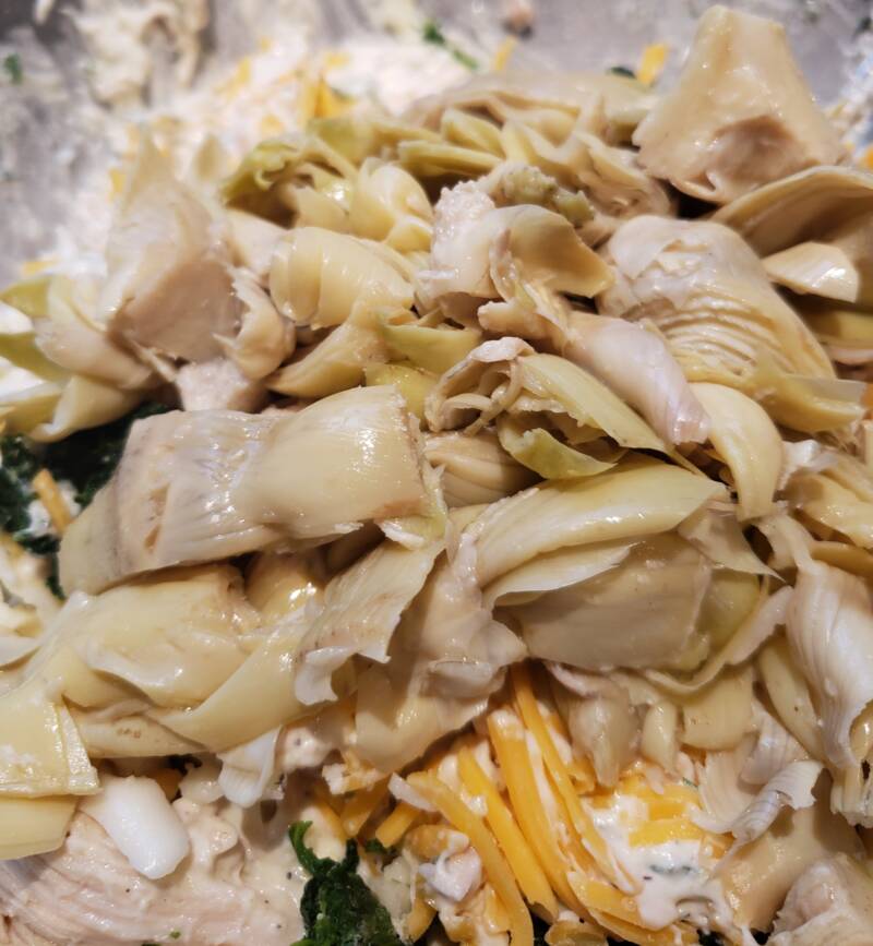 - Add the chicken, artichokes and spinach, mozzarella cheese and cheddar.