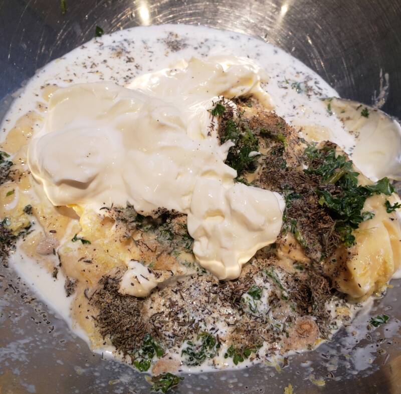 In a bowl, stir together the cottage cheese, sour cream, cream of chicken soup (I make my own Keto version), lemon juice and zest, garlic powder, onion powder, parsley, onion, garlic, pepper and milk.