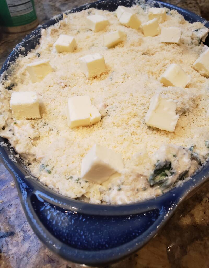 - Top with Parmesan and dot with butter.