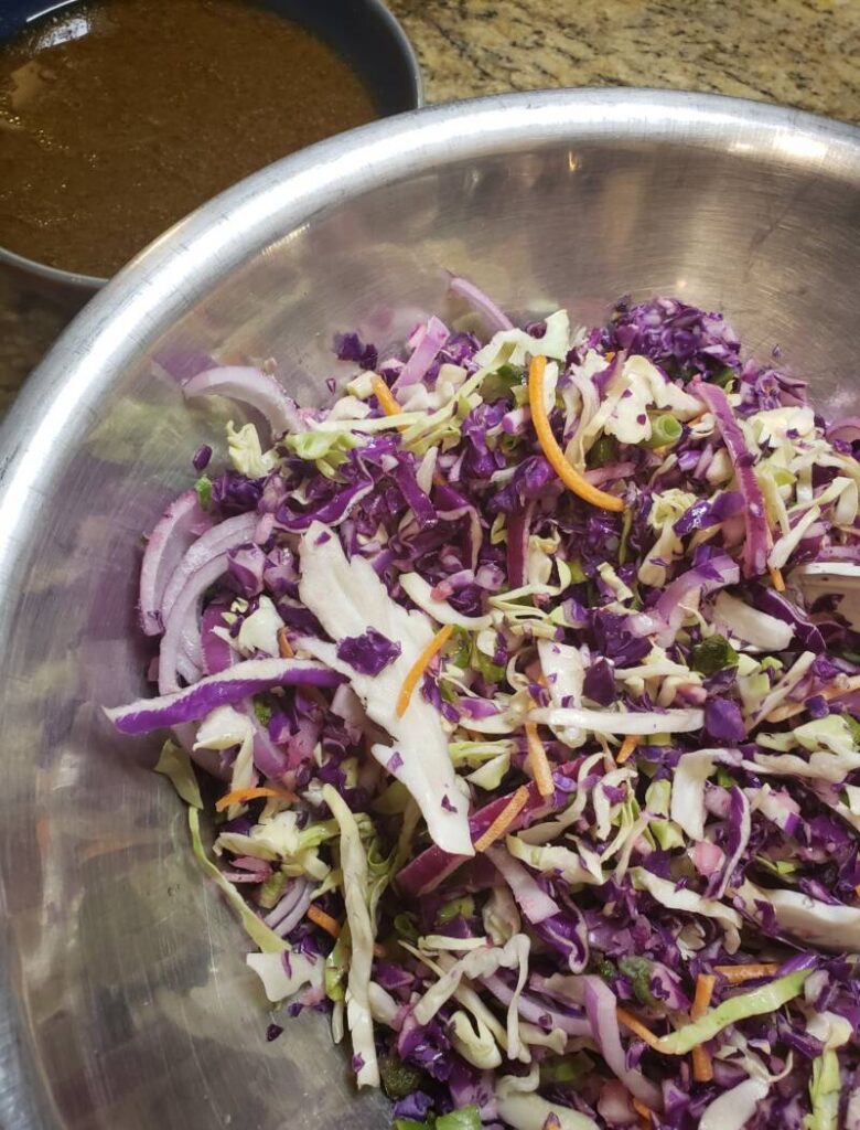 - In a large bowl, combine the slaw ingredients, making sure to add the toasted sesame seeds.