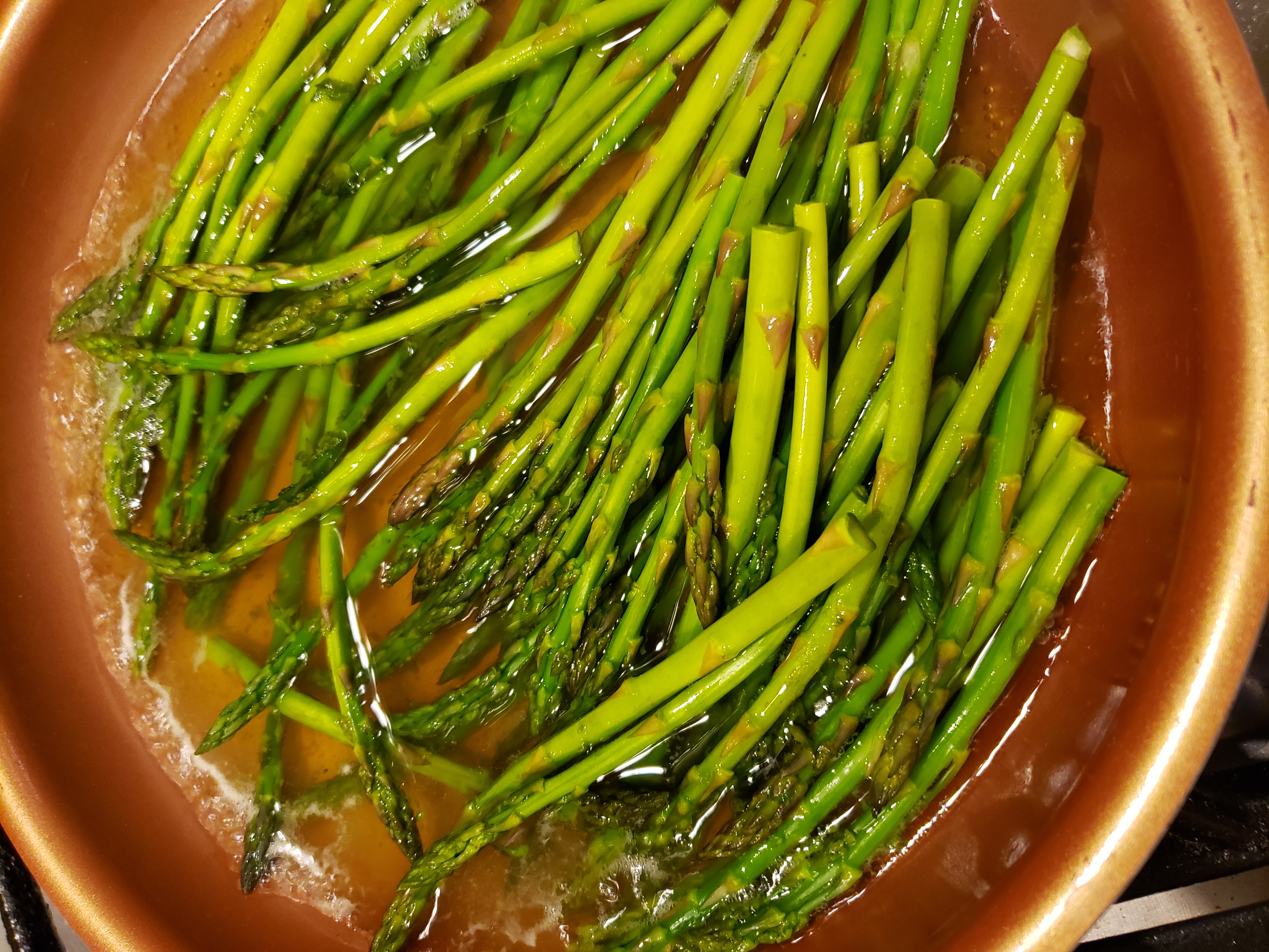 In a small frying pan, boil some water. When the water comes to a rolling boil, drop in the asparagus spears. Boil for 3 minutes. Plunge the asparagus in the ice bath.