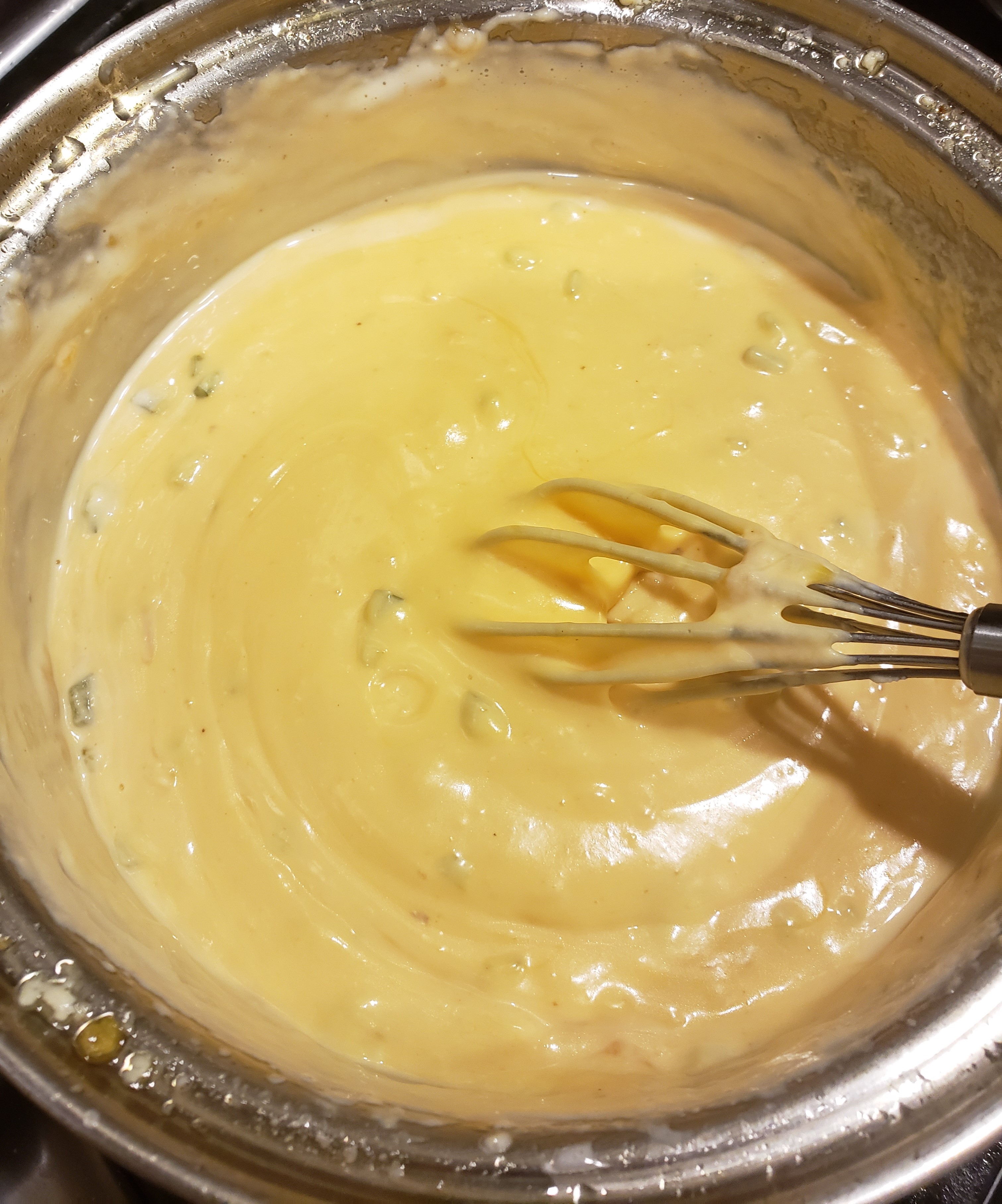 - In a saucepan, combine the sour cream, cream cheese and butter. Stir until cream cheese and butter are melted.