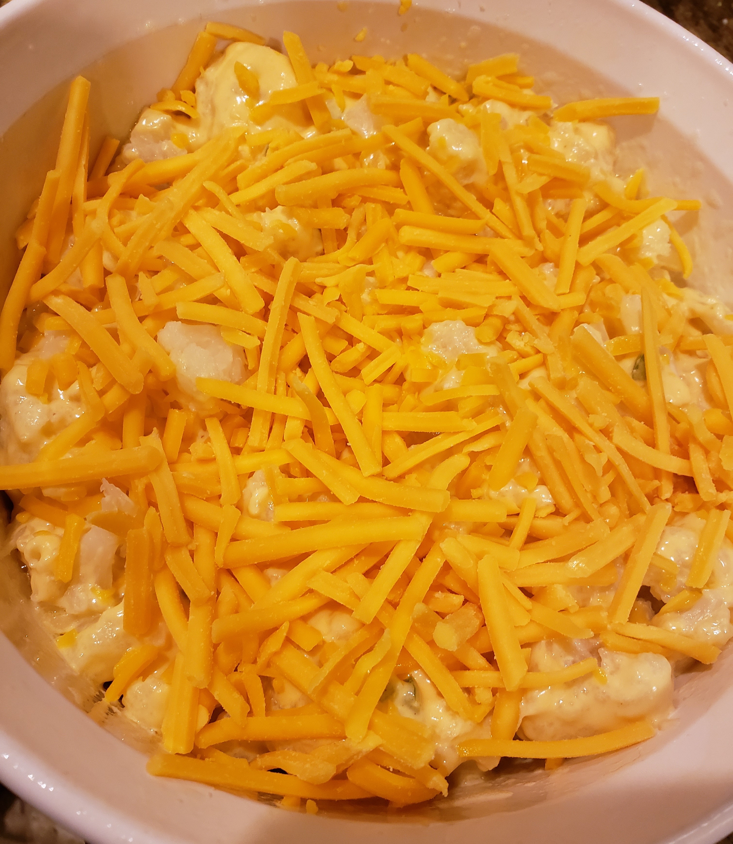 - Sprinkle the shredded cheddar cheese over the top.