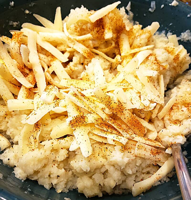 - When as much water is squeezed out as you can, place the mashed cauliflower and riced cauliflower in a bowl together and mix.