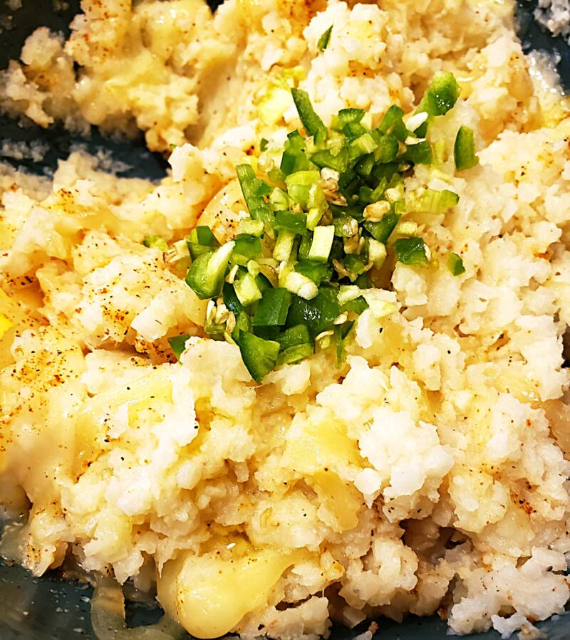 After the water is removed, place the mashed and riced cauliflower in a bowl. Mix. Voila! This is my Keto hack for grits!