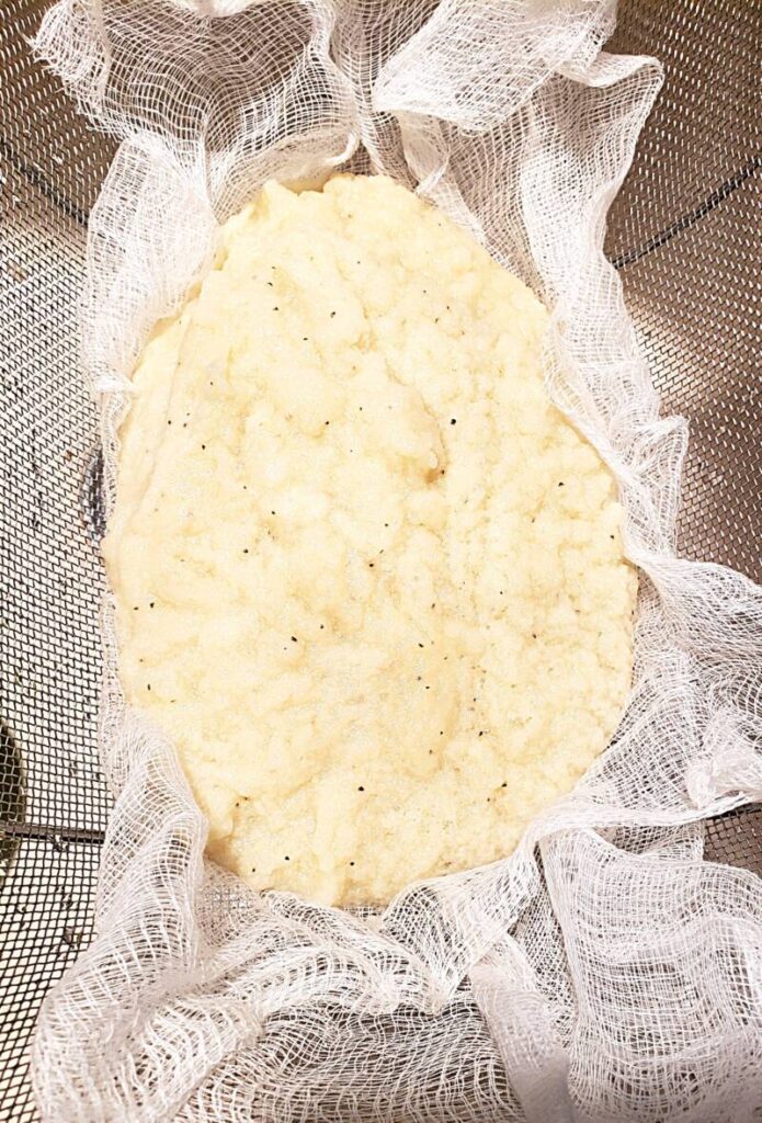 - Squeeze out the water from the mashed cauliflower using a cheesecloth.