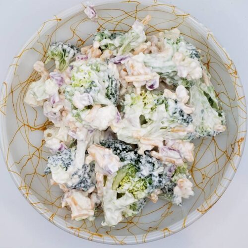 This is one of my favorite salads! It is so easy to make, and it is a big hit for potlucks and gatherings. The creamy dressing and cheese complement the crunchy veggies and make this salad perfect for the coming hot summer days. Serve this salad alongside smoked meats, BBQ or burgers and dogs. It’s perfect!