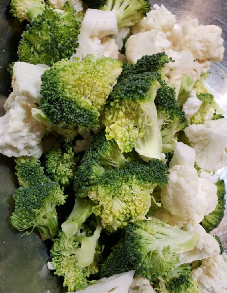 - In a large mixing bowl, combine the broccoli and cauliflower.