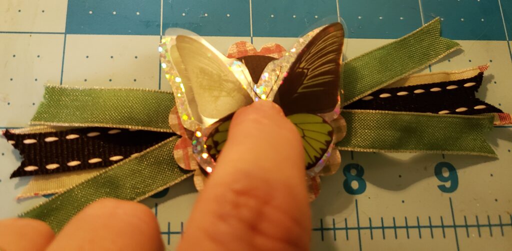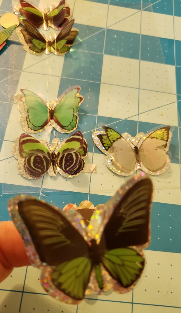The most time-consuming part of this project was selecting the stickers and paper to use. I selected the stickers first. I settled on some beautiful 3-dimensional butterfly stickers that I got at Dollar Tree. I selected the paper from my scrap paper that coordinated well with the colors in the butterflies.