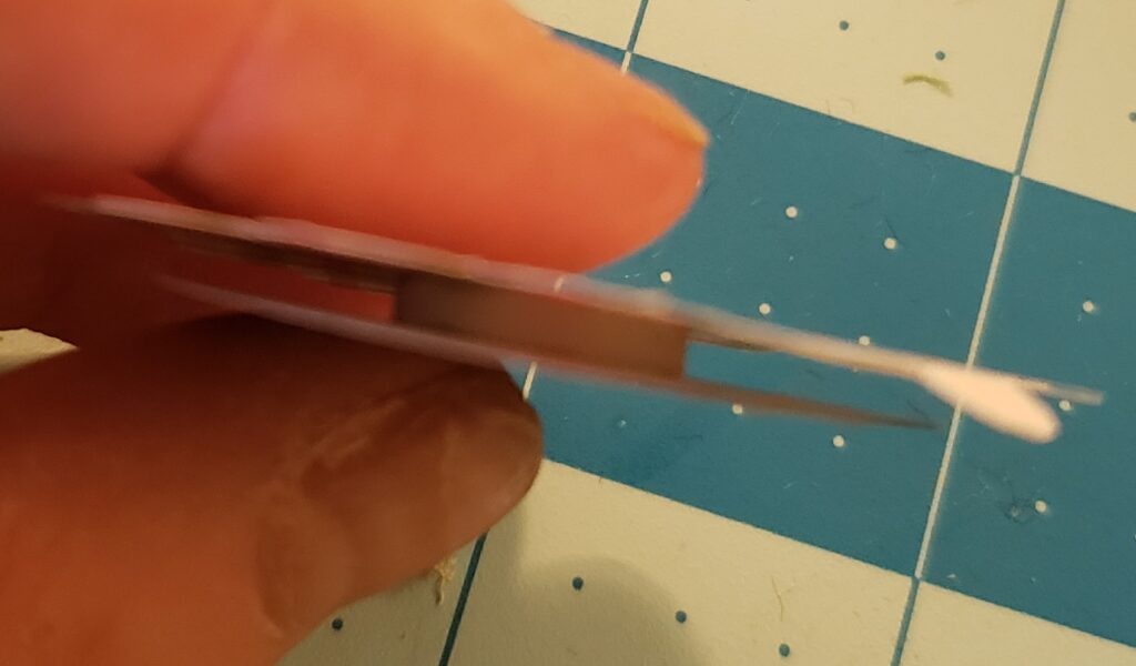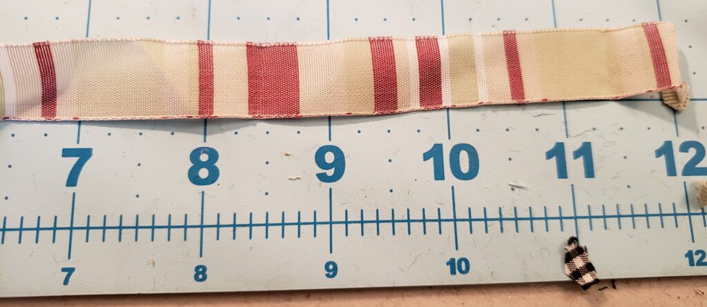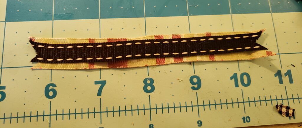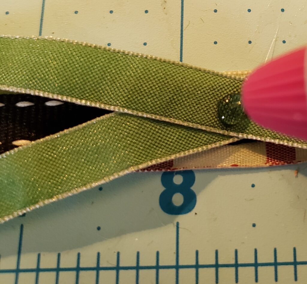 I then selected some ribbons in coordinating colors and measured them on my cutting mat. Before I attached them, I snipped some dovetails on each end.