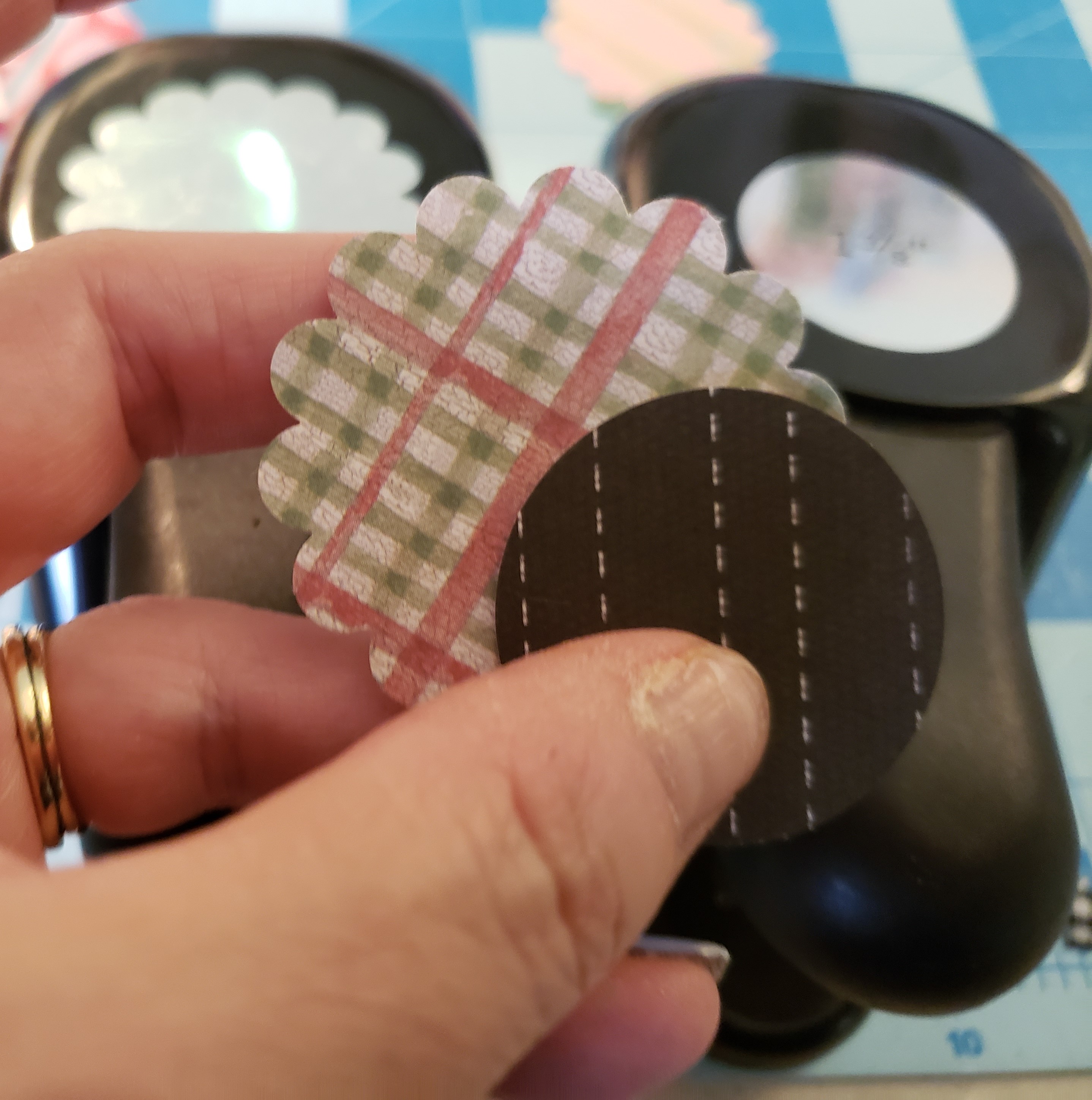 Using a large scallop punch, I punched the paper I would use. I also punched circles from a coordinating paper that was a little bit smaller than the scalloped punch.