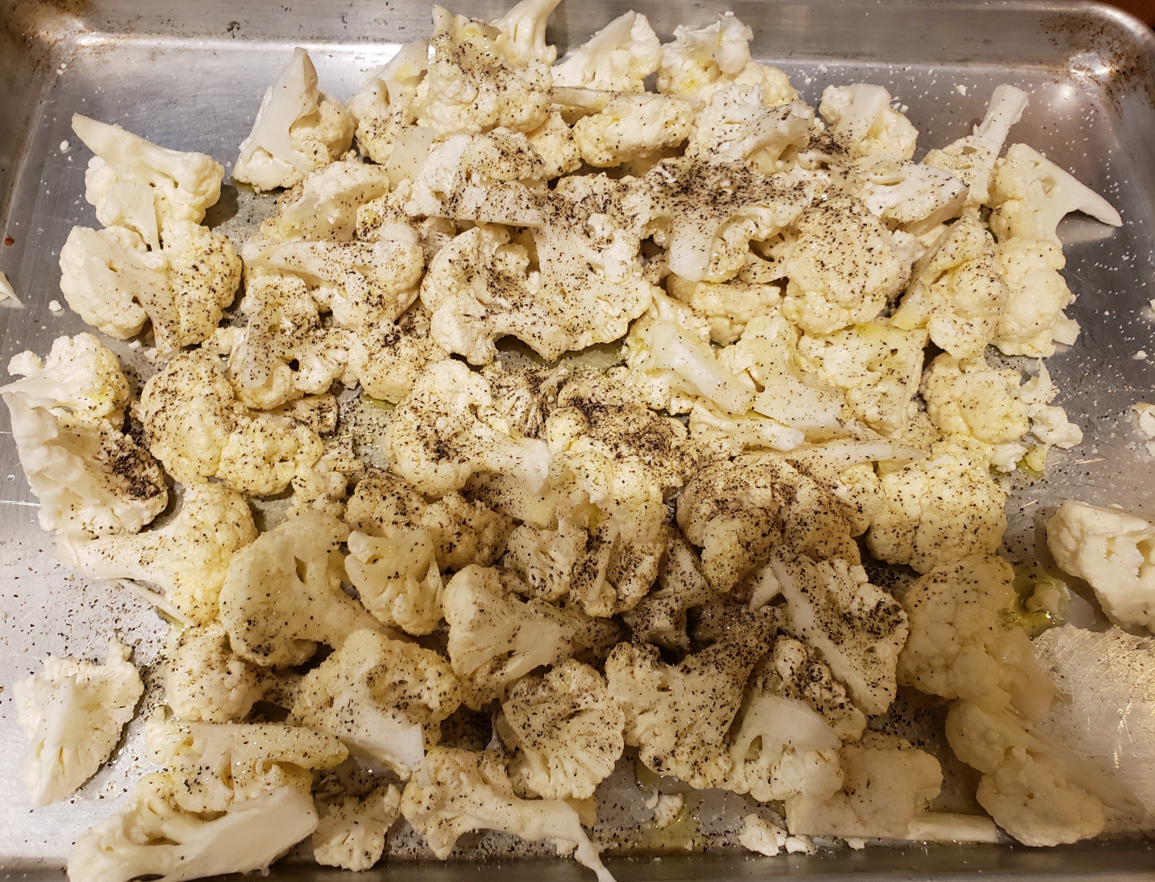 Preheat the oven to 400 degrees. Cut the cauliflower into florets. Place cauliflower on a large baking sheet. Sprinkle with salt and pepper.