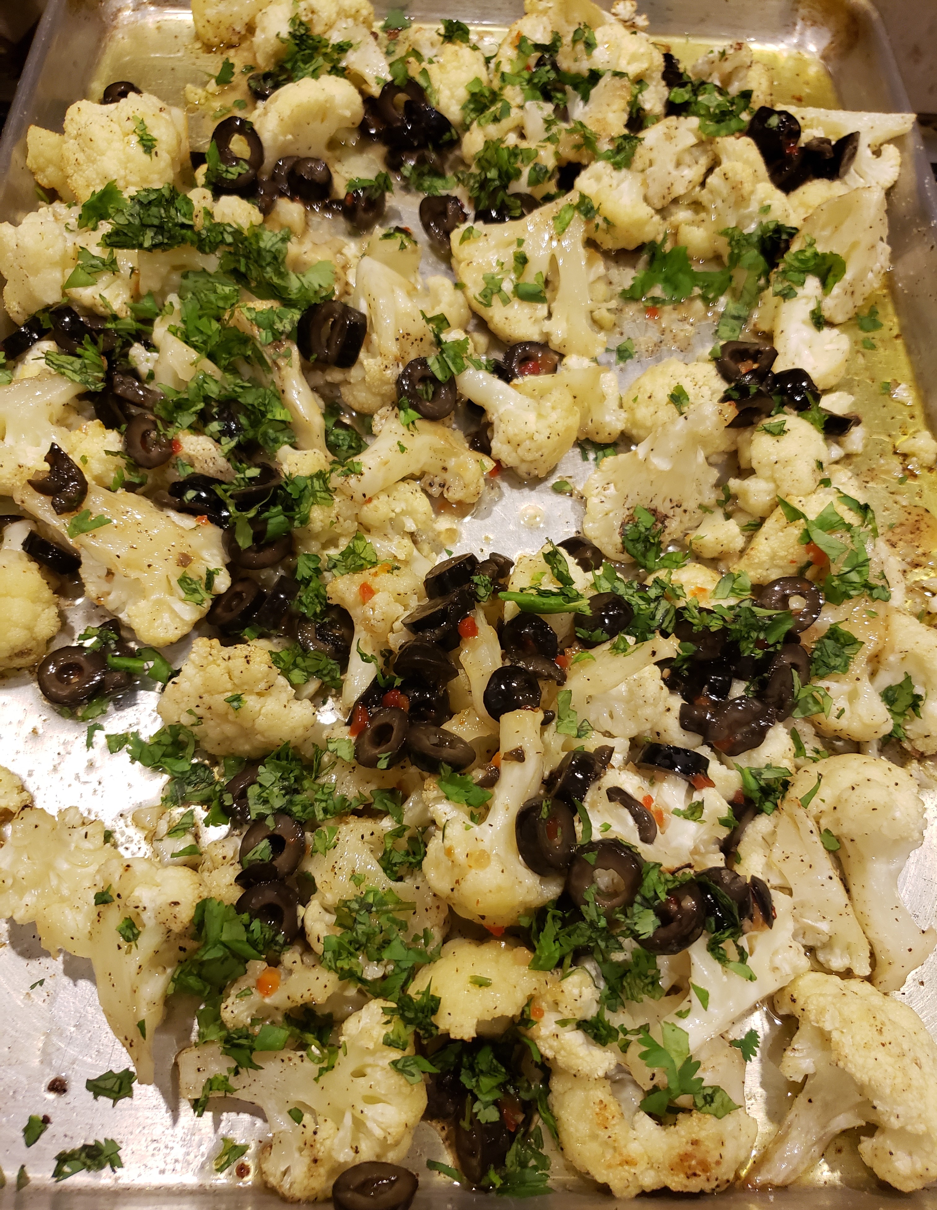 Sprinkle generously with salt and pepper. Using your hands, toss the cauliflower and olive mixture until the cauliflower is well coated with the Italian dressing.
