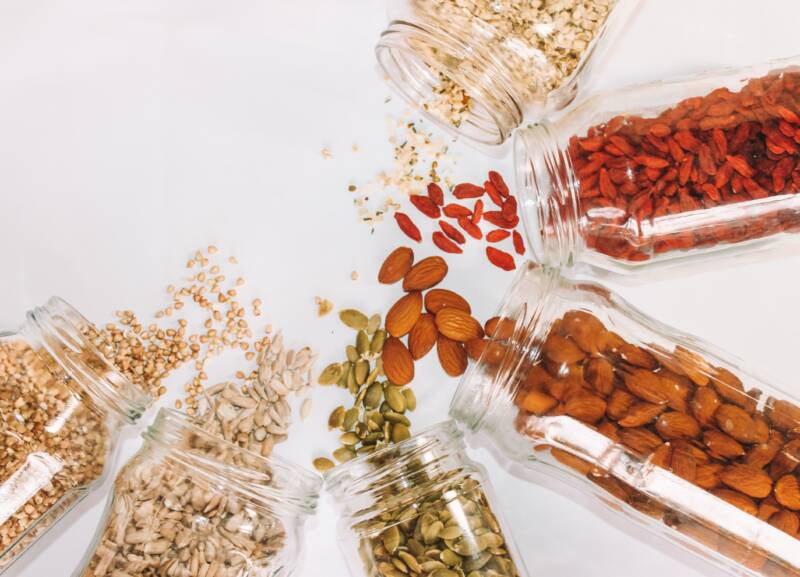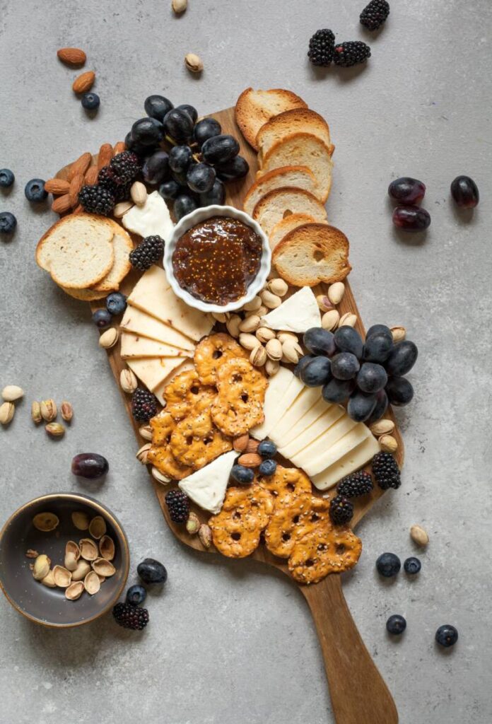 Now that your charcuterie tray contains the main elements, you can step back and look at the blank spaces that remain. Fill those in with nuts, crackers, and dried fruit. Fresh grapes are also a pretty addition.