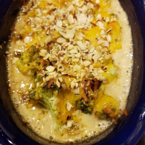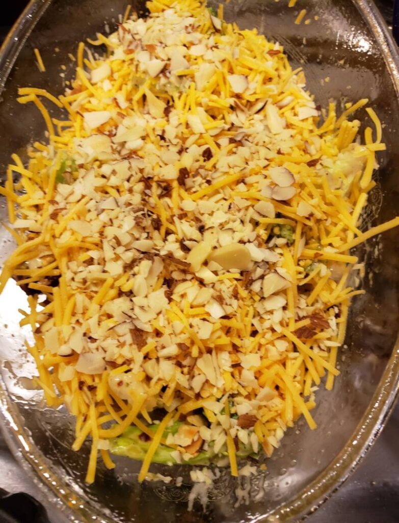 Add the broccoli and bacon. Stir gently to coat and combine. Pour into a greased baking dish. Top with cheese, more bacon and almonds.