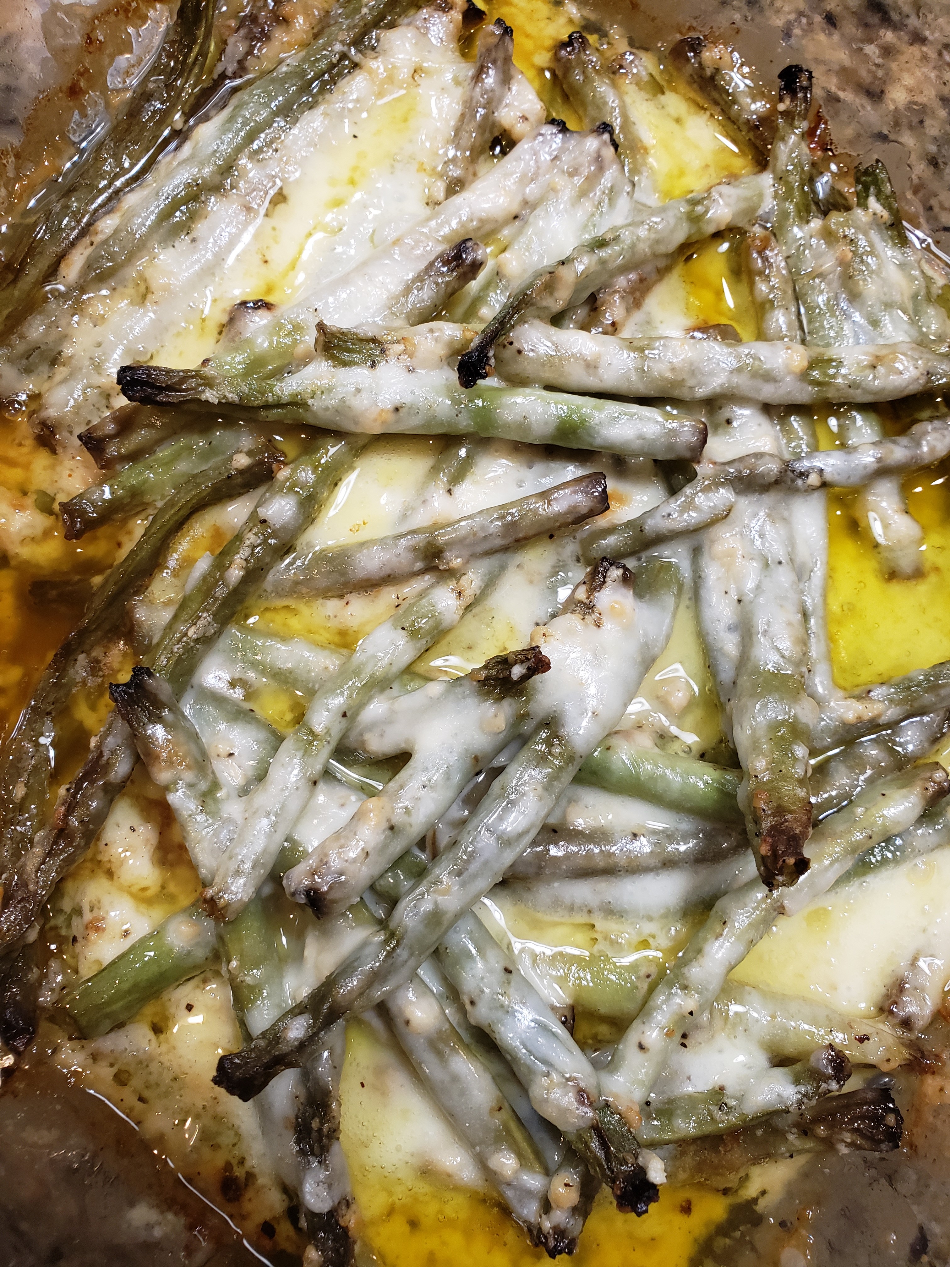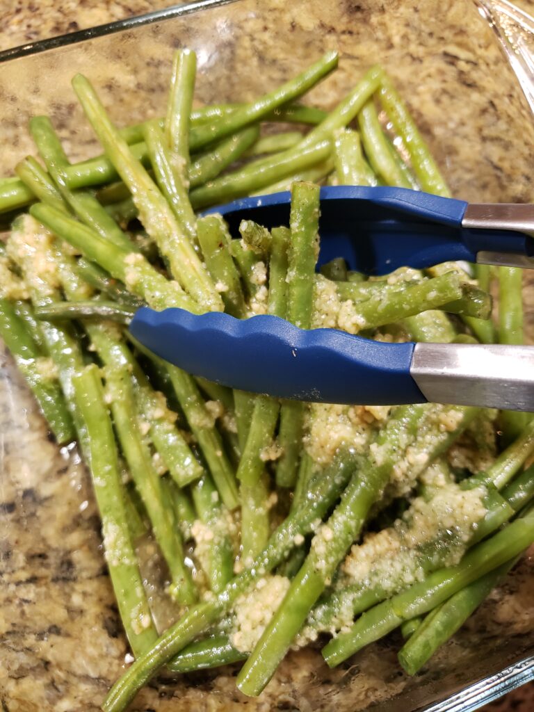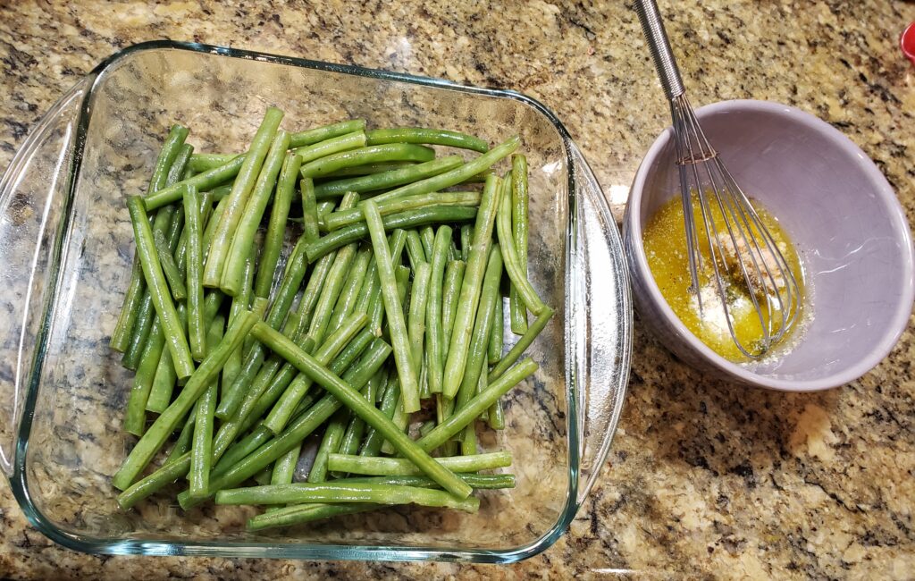 Preheat the oven to 425 degrees. In an 8×8 baking dish sprayed with cooking spray, place the green beans in a single layer. In a small bowl, mix the olive oil and garlic together. If you feel you want to use more garlic than 2 Tbsp., I am not against that. The more the merrier!