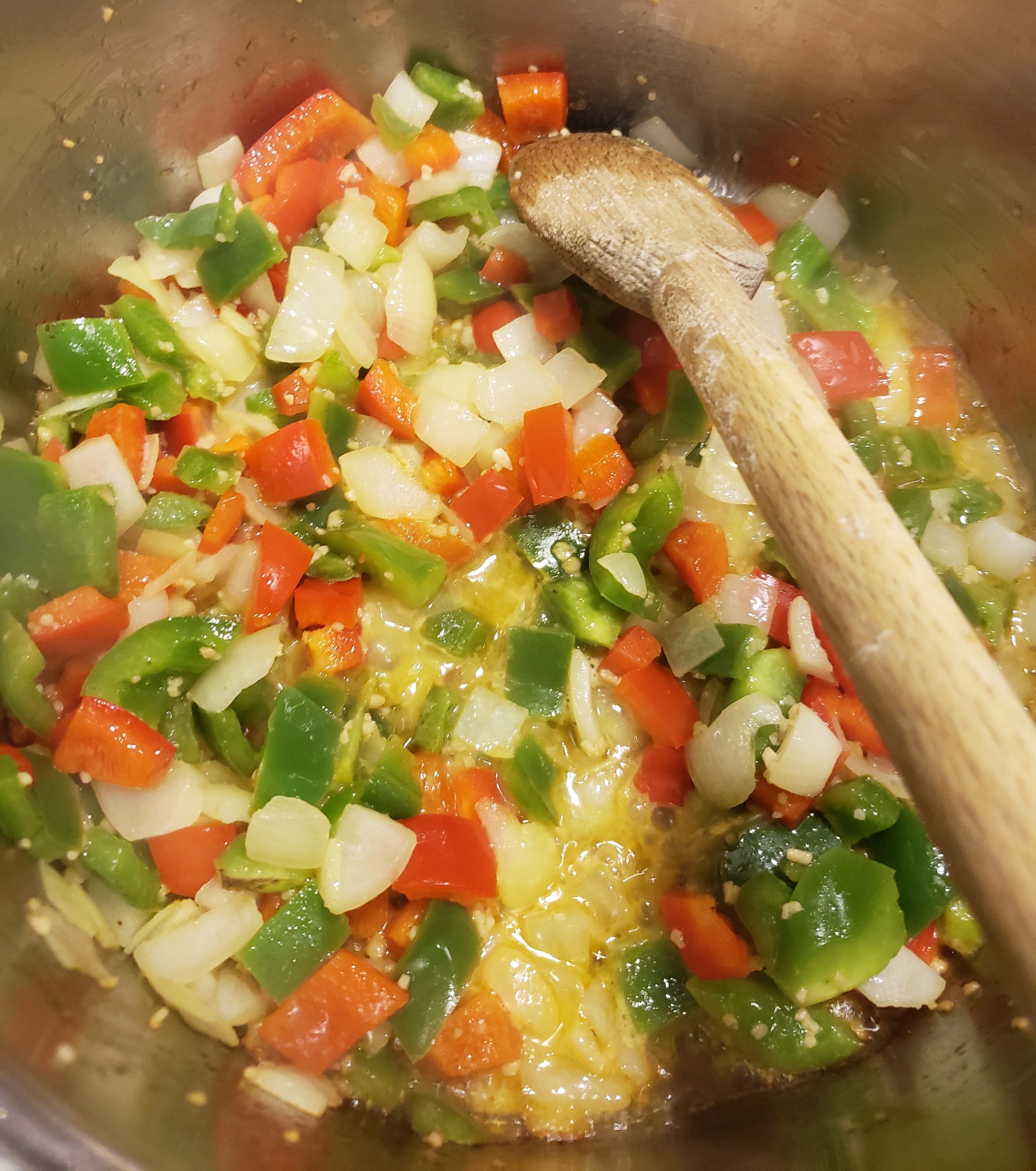 In a large Dutch oven, sauté the onions, peppers and garlic in butter. If you happen to have some rendered bacon grease, the flavor will be amazing! Cook and stir until vegetables are soft.